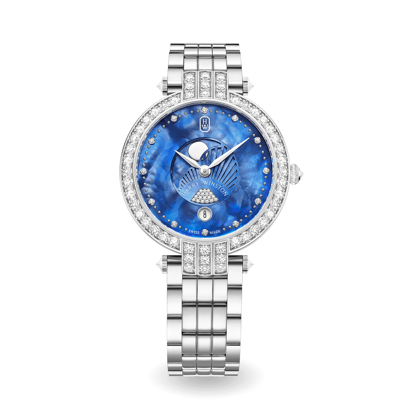 Harry Winston introduces the Premier Moon Phase 36mm, an enchanting timepiece that marries the beauty of mother-of-pearl with the sophistication of a moon phase complication. The scenery captures the serene beauty of the celestial sky, with a mesmerizing moon that appears to travel across the horizon, before finding its way behind a mother-of-pearl design, signifying the end of the lunar cycle.