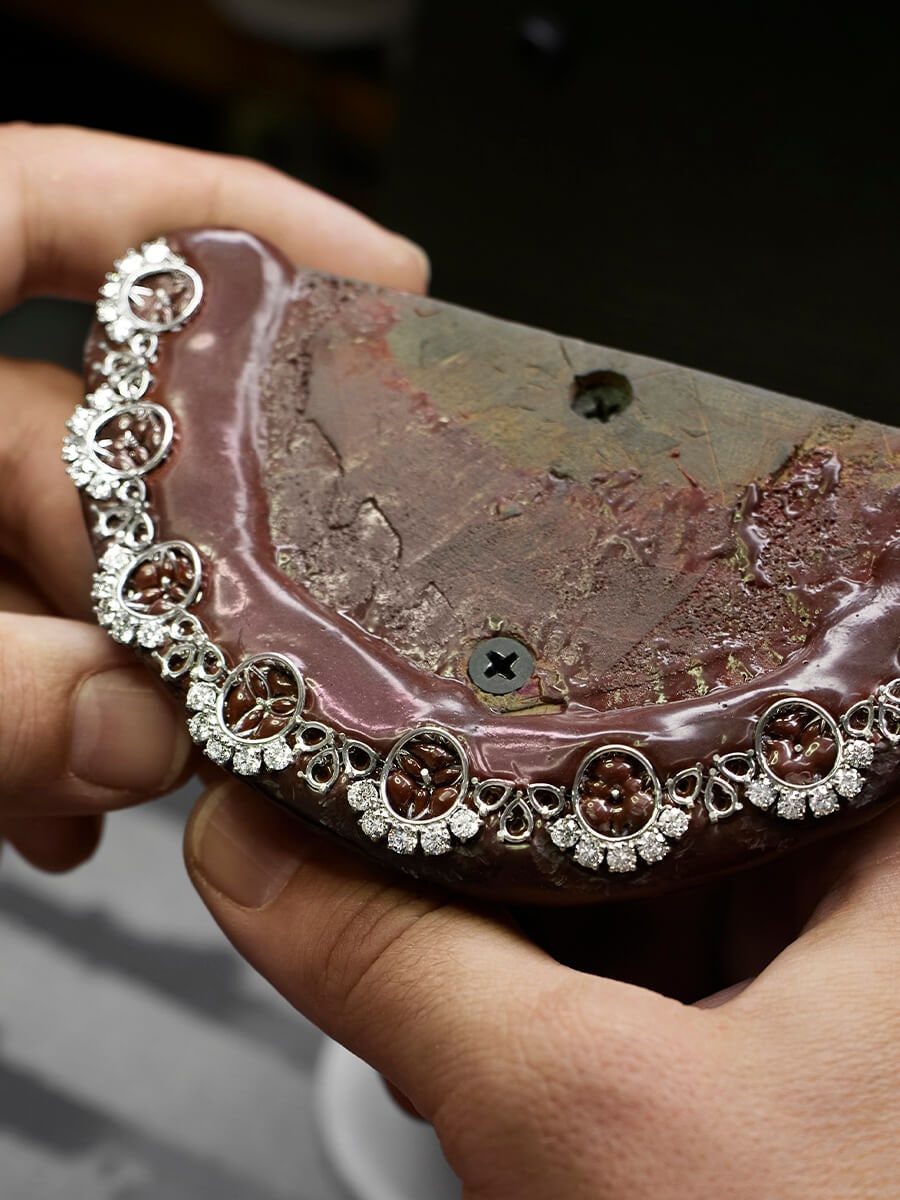 White South Sea pearls weighing 7.41 carats each are illuminated by a halo of brilliant diamonds and pear-shaped turquoise cabochons.