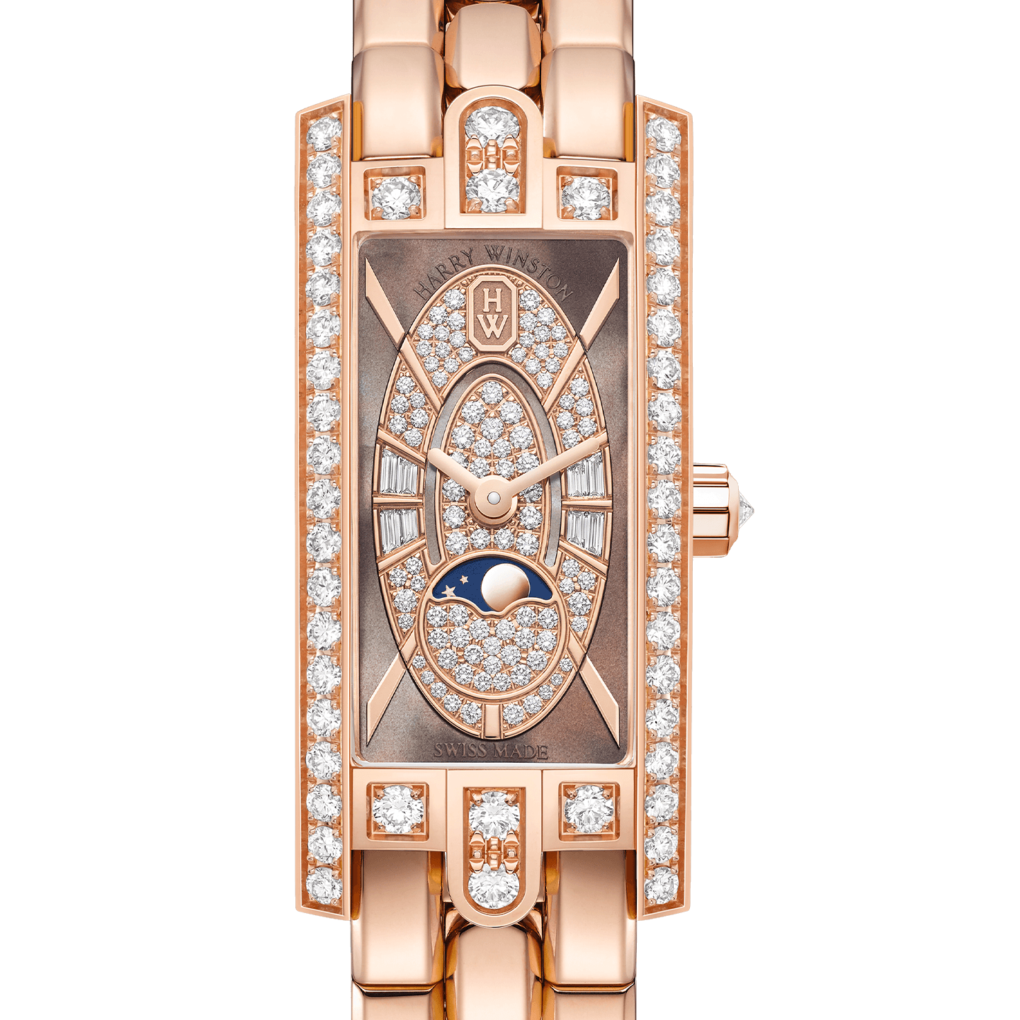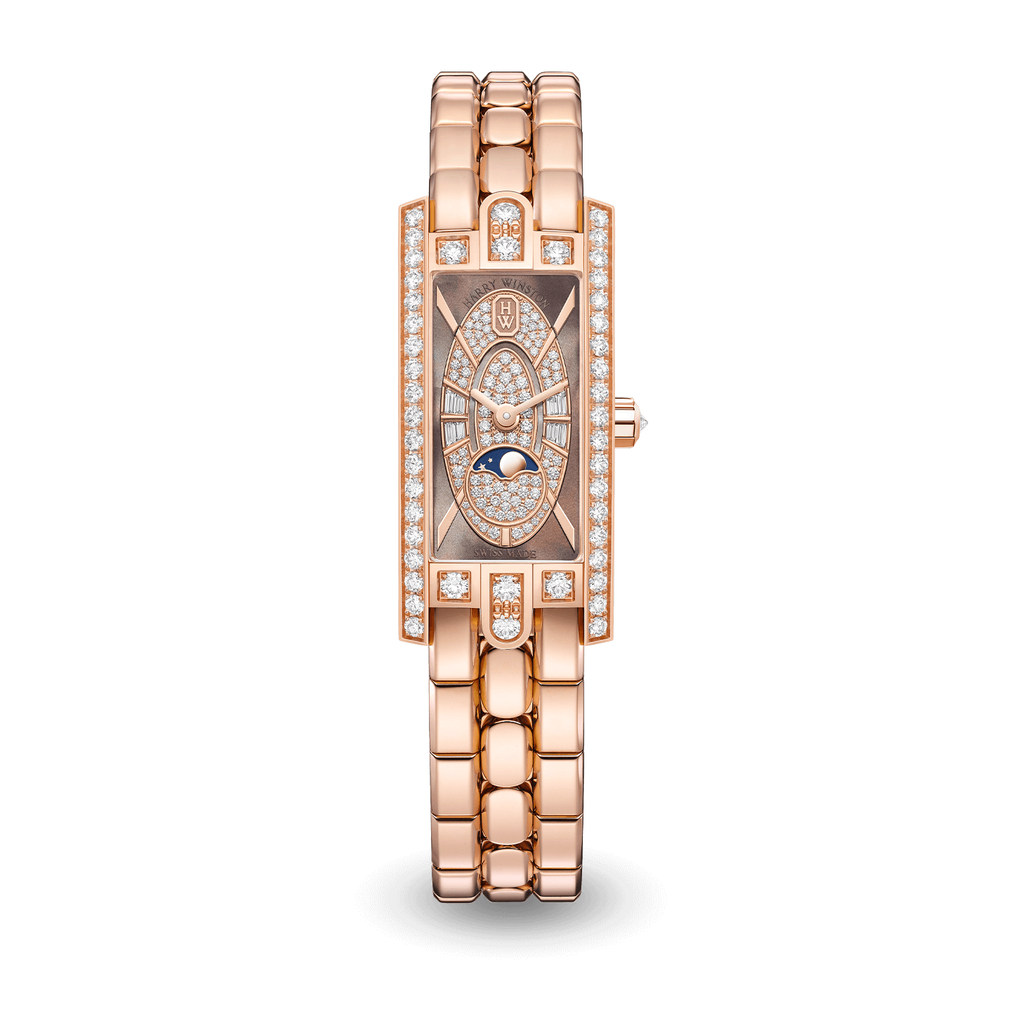Celebrating its 20th anniversary, the Avenue collection revisits its most successful models, including the delightful Avenue C Mini Moon Phase. The combination of bold geometric shapes and Harry Winston’s hallmark diamonds adds volume and light to this classic timepiece.