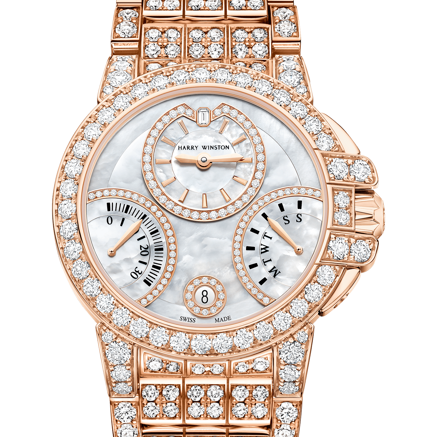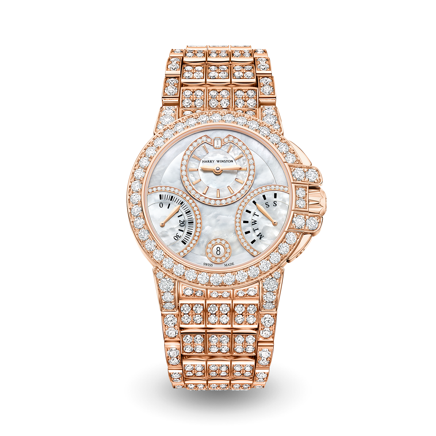 Harry Winston’s Ocean timepiece collection welcomes a white Biretrograde model into the sporty yet elegant series. Mother-of-pearl dial mingle with round brilliant diamonds in an 18-karat gold case. A winning combination of resilience, sophistication and impressive retrograde complications, this iteration is the essence of versatility.