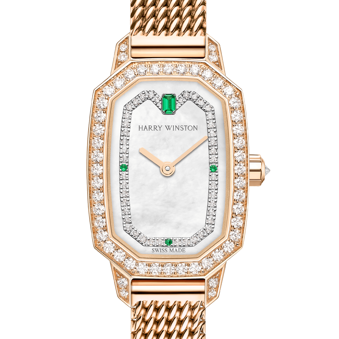 Adorned with intense green tones, diamonds and mother-of-pearl, the Harry Winston Emerald is the perfect luxury accessory for women who want both the practicality of a timepiece and the hallmark glamour of Harry Winston jewels.