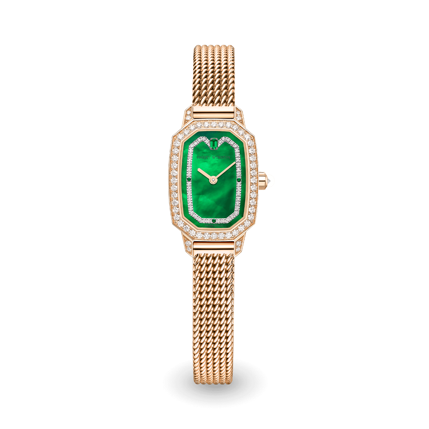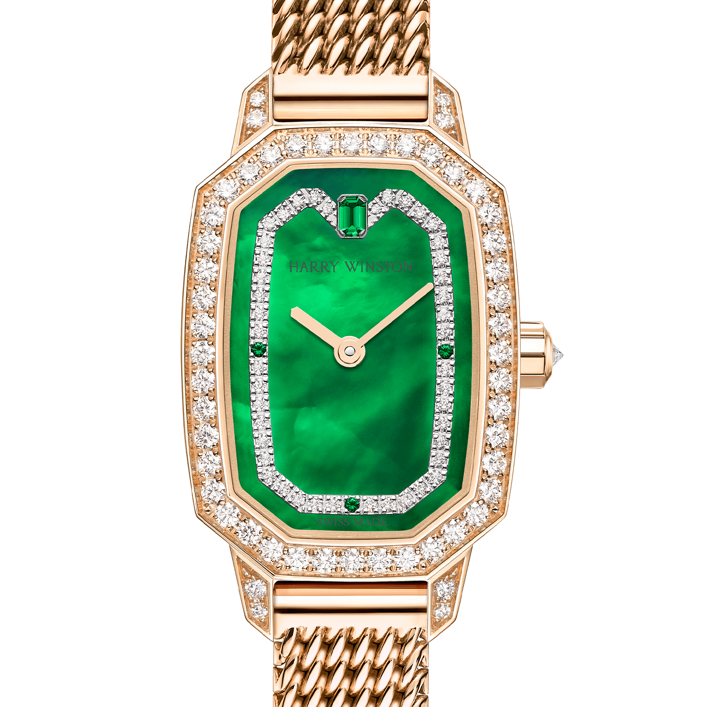 Adorned with intense green tones, diamonds and mother-of-pearl, the Harry Winston Emerald is the perfect luxury accessory for women who want both the practicality of a timepiece and the hallmark glamour of Harry Winston jewels.
