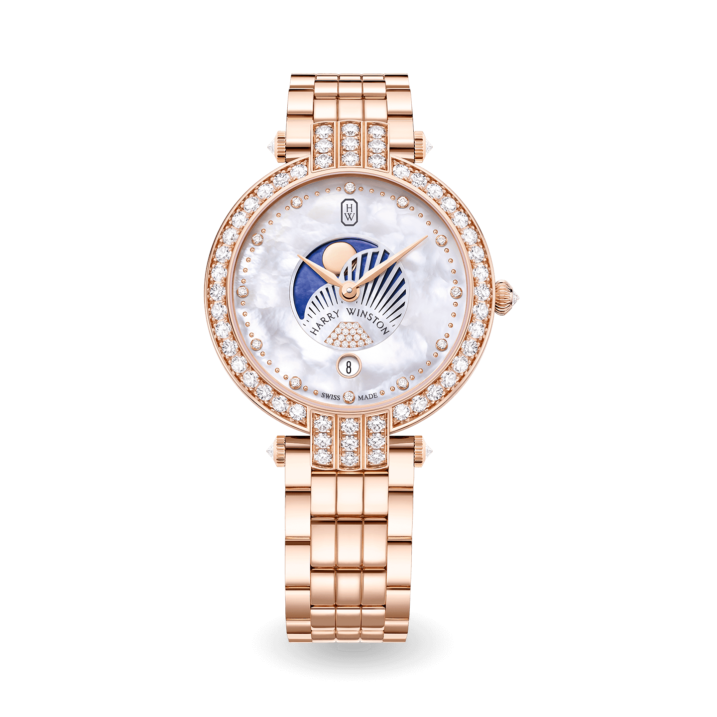 Harry Winston introduces the Premier Moon Phase 36mm, an enchanting timepiece that marries the beauty of mother-of-pearl with the sophistication of a moon phase complication. The scenery captures the serene beauty of the celestial sky, with a mesmerizing moon that appears to travel across the horizon, before finding its way behind a mother-of-pearl design, signifying the end of the lunar cycle.