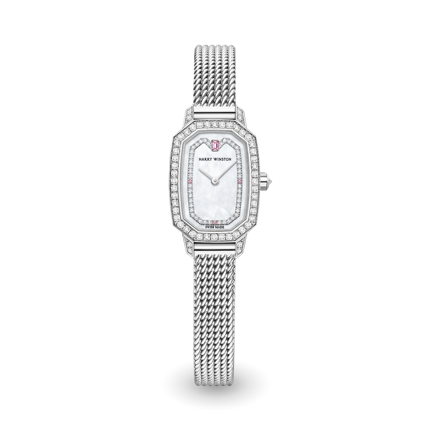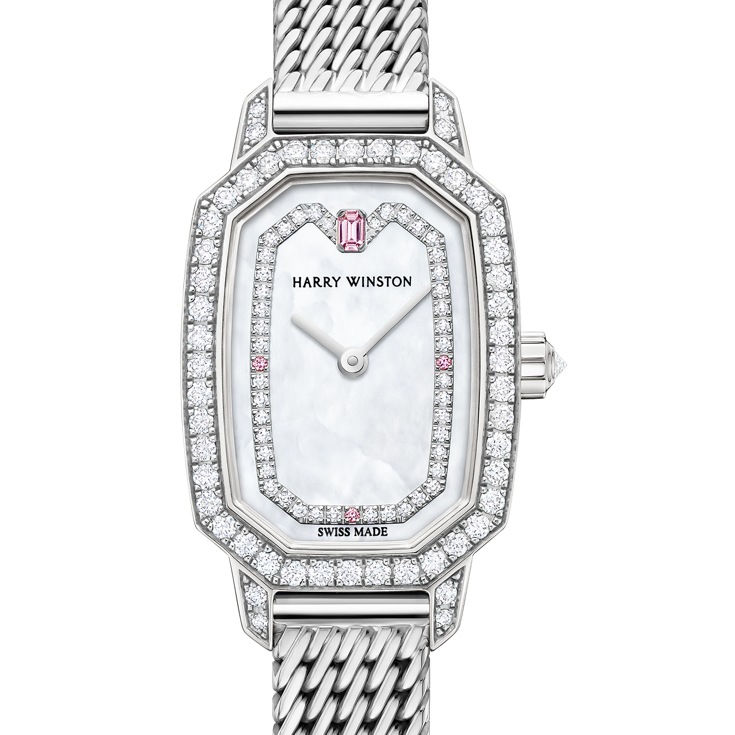 Adorned with soft pink tones, diamonds and mother-of-pearl, the Harry Winston Emerald is the perfect luxury accessory for women who want both the practicality of a timepiece and the hallmark glamour of Harry Winston jewels.