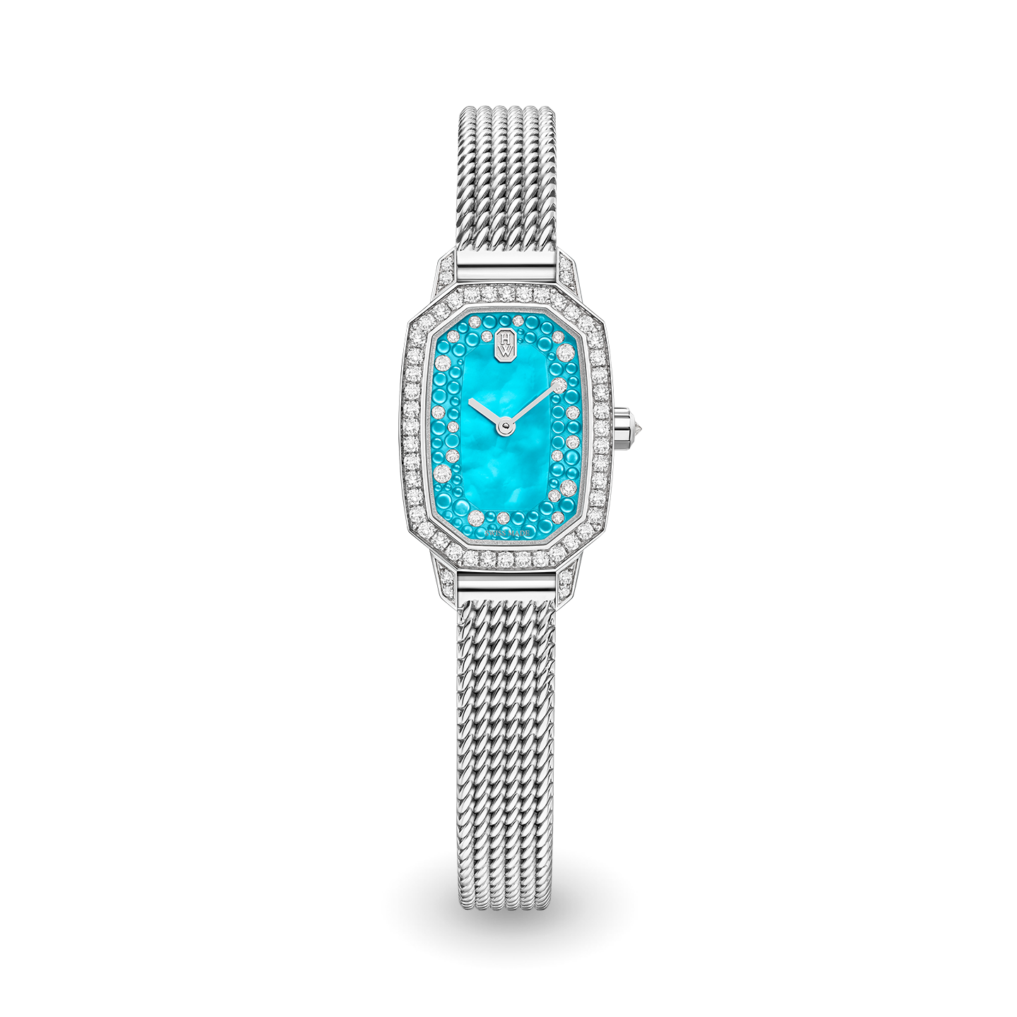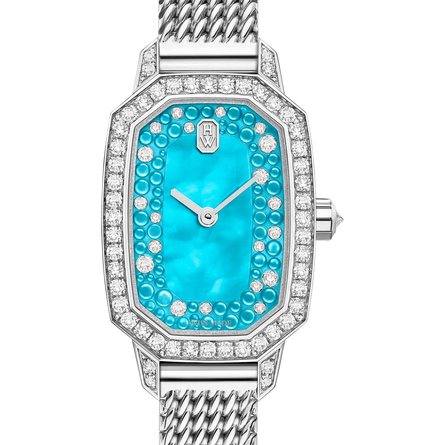A new palette of captivating colors enriches Harry Winston’s sophisticated Emerald collection. With a winning combination of iridescent mother-of-pearl and icy diamonds, the dial of this Emerald timepiece delights with colorful cabochon adornments.