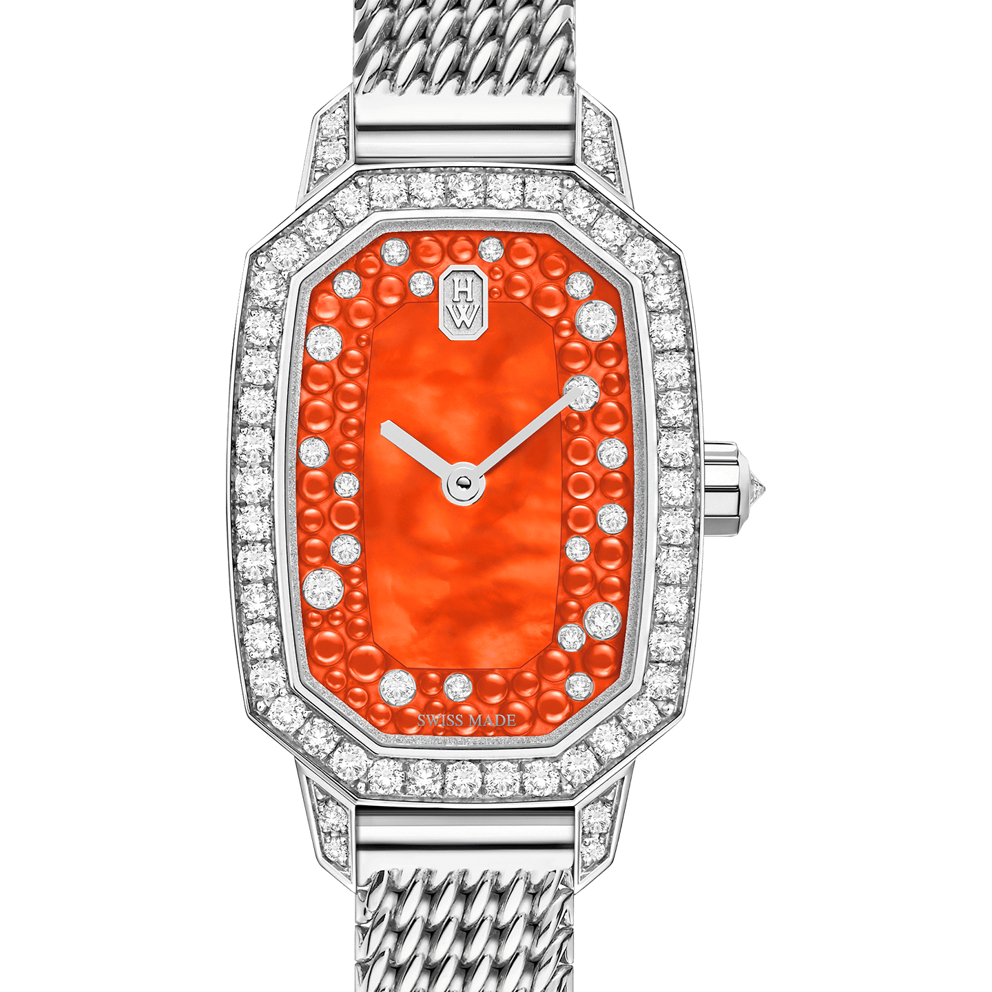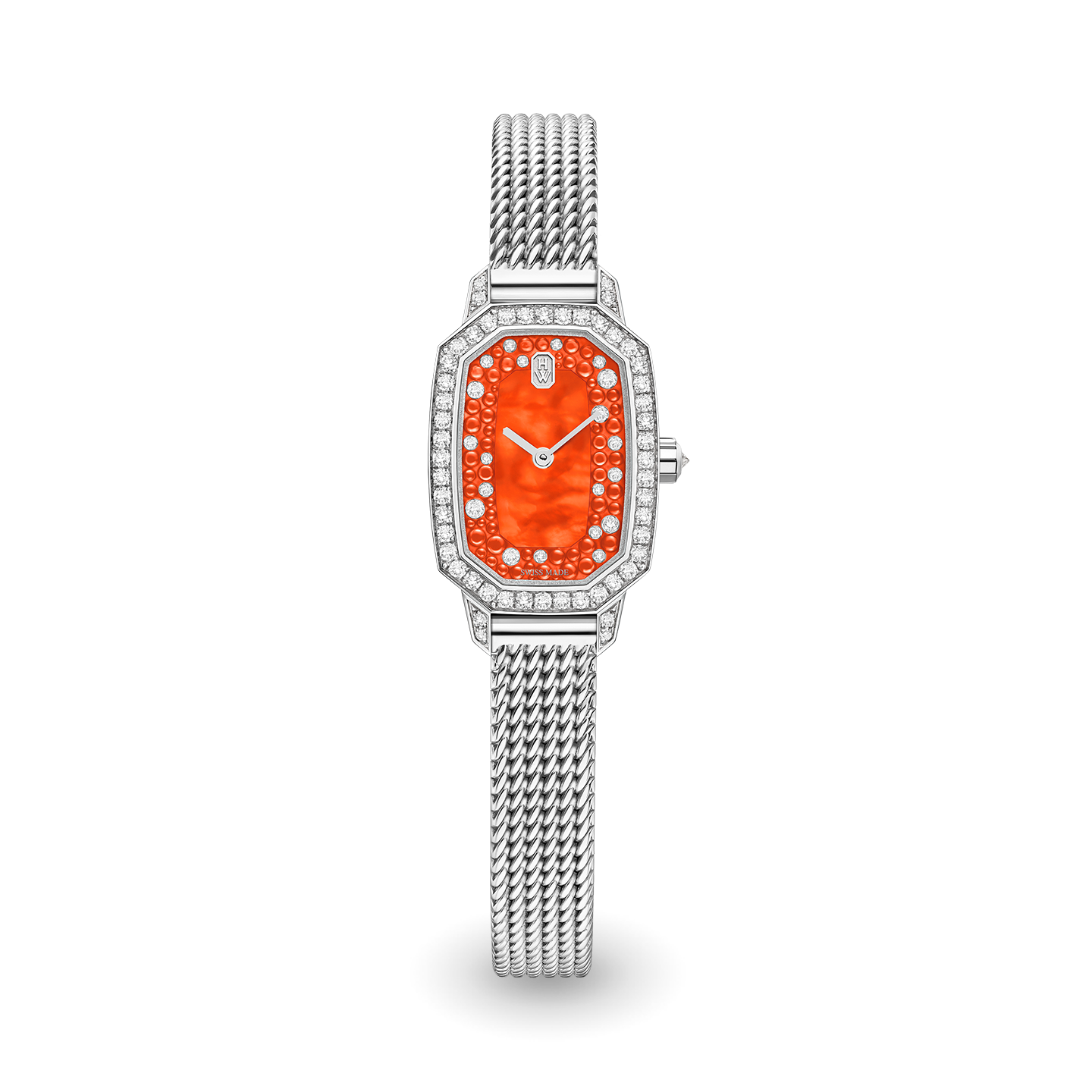 A new palette of captivating colors enriches Harry Winston’s sophisticated Emerald collection. With a winning combination of iridescent mother-of-pearl and icy diamonds, the dial of this Emerald timepiece delights with colorful cabochon adornments.