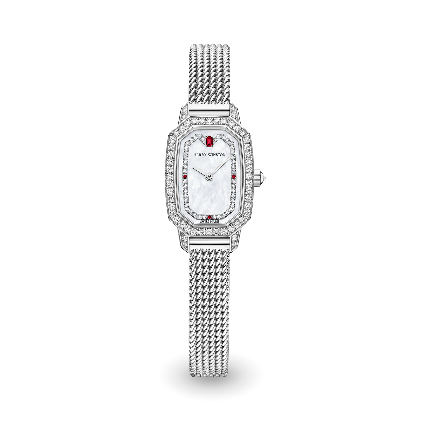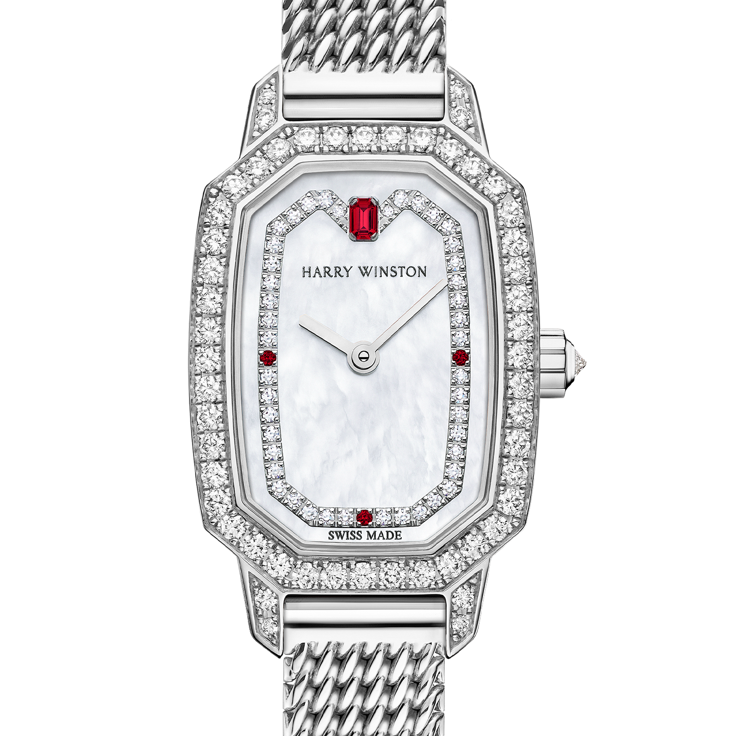 Adorned with intense red tones, diamonds and mother-of-pearl, the Harry Winston Emerald is the perfect luxury accessory for women who want both the practicality of a timepiece and the hallmark glamour of Harry Winston jewels.