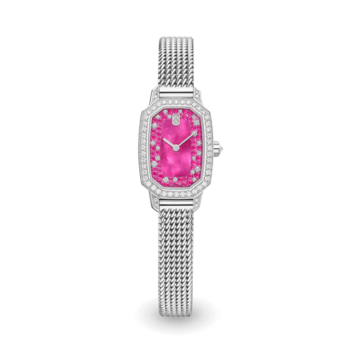 A new palette of captivating colors enriches Harry Winston’s sophisticated Emerald collection. With a winning combination of iridescent mother-of-pearl and icy diamonds, the dial of this Emerald timepiece delights with colorful cabochon adornments.