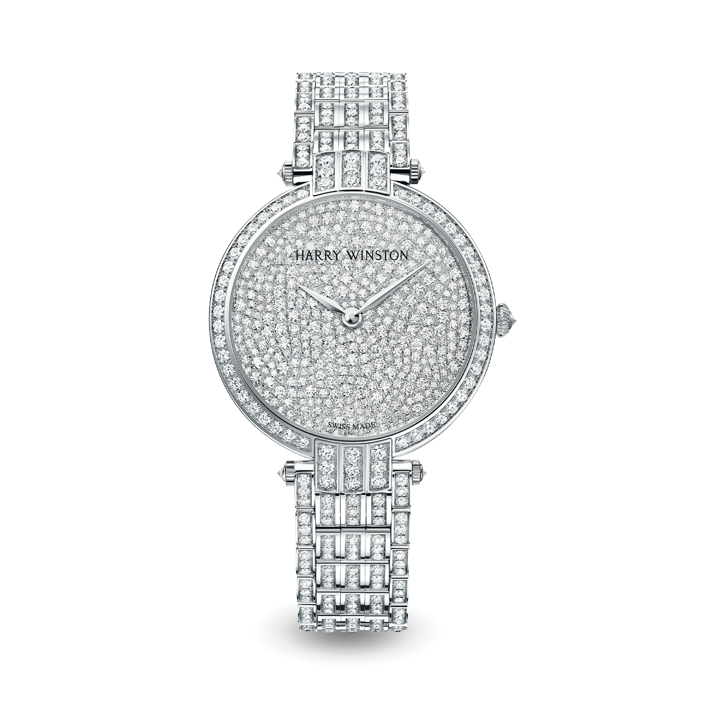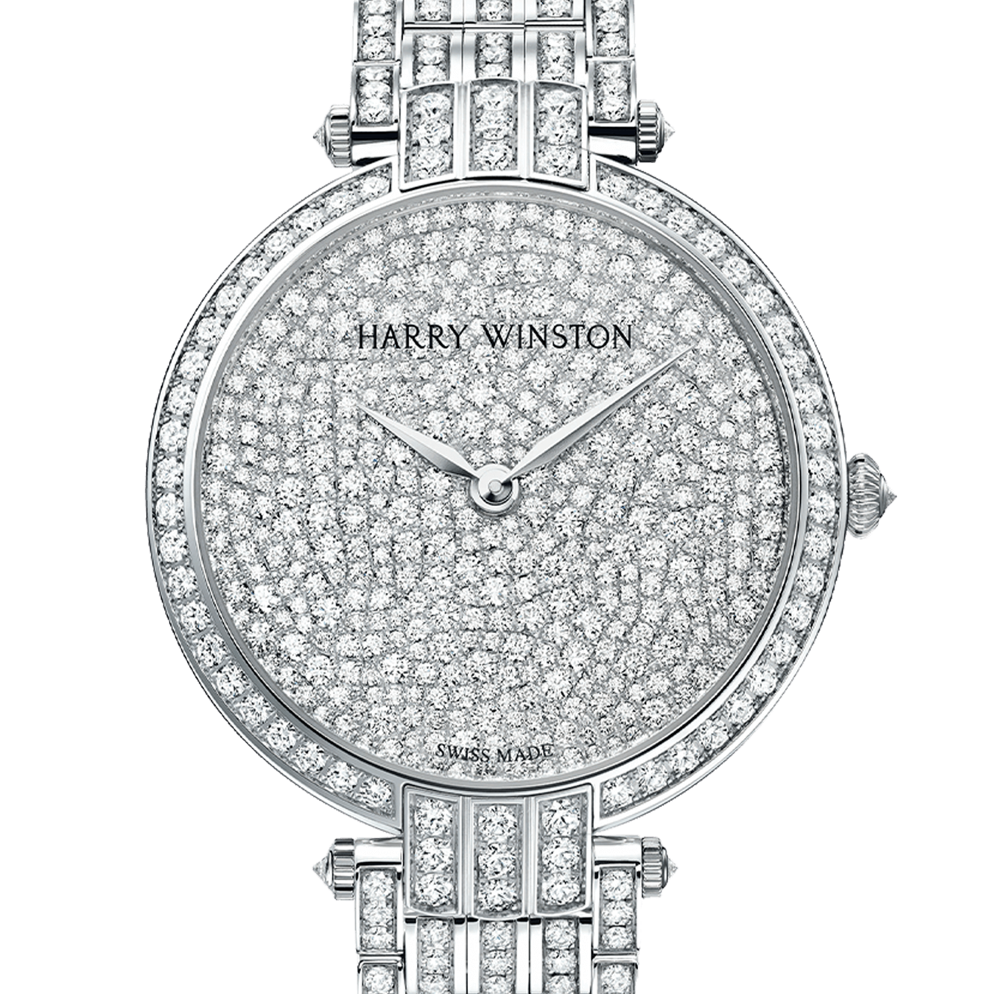 Reminiscent of the sun sparkling off a pristine snowfield on crisp winter days, the Premier Ladies 36mm boasts a snow-set dial embedded with the finest quality brilliant-cut diamonds. This timepiece is an eloquent tribute to the glamour, refined elegance, unparalleled setting expertise and unique diamonds that are hallmarks of the House of Harry Winston.