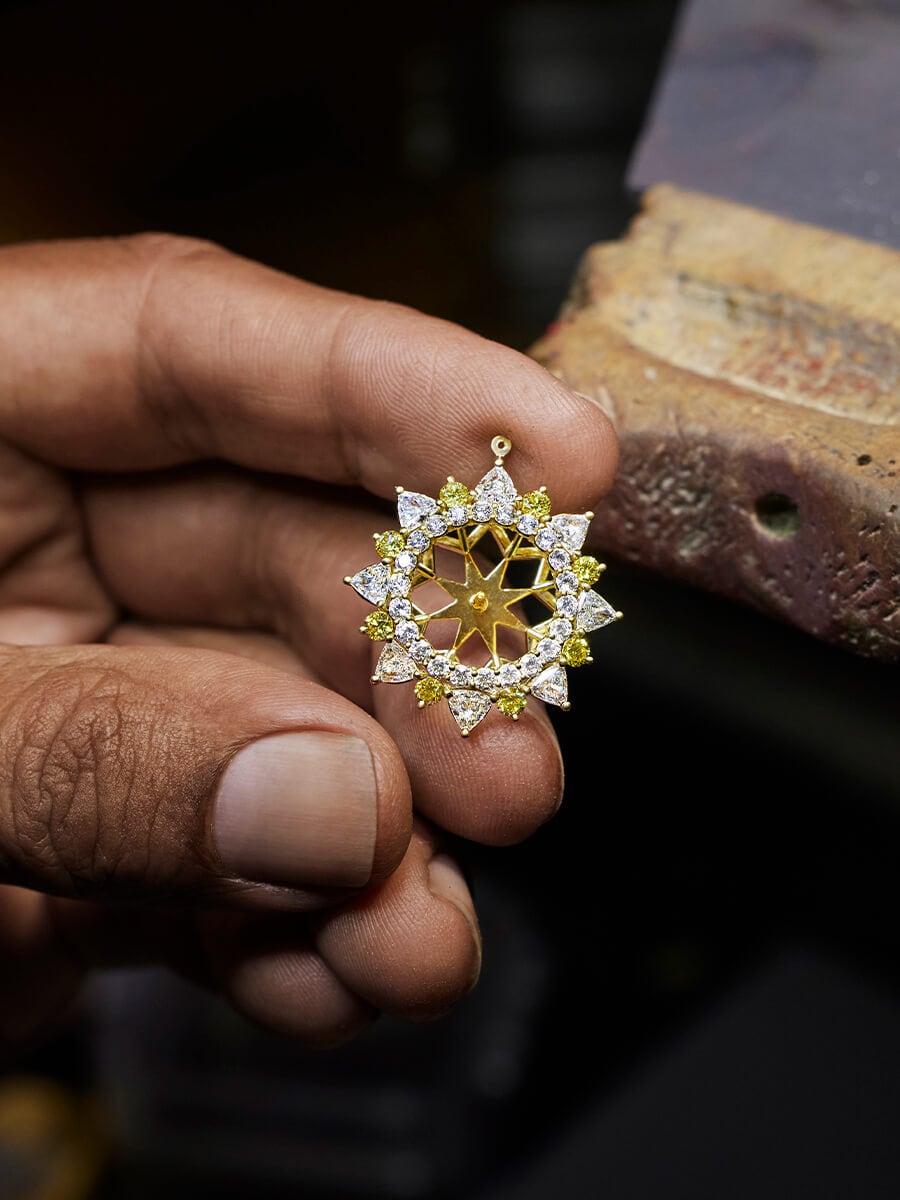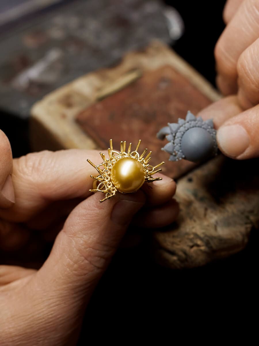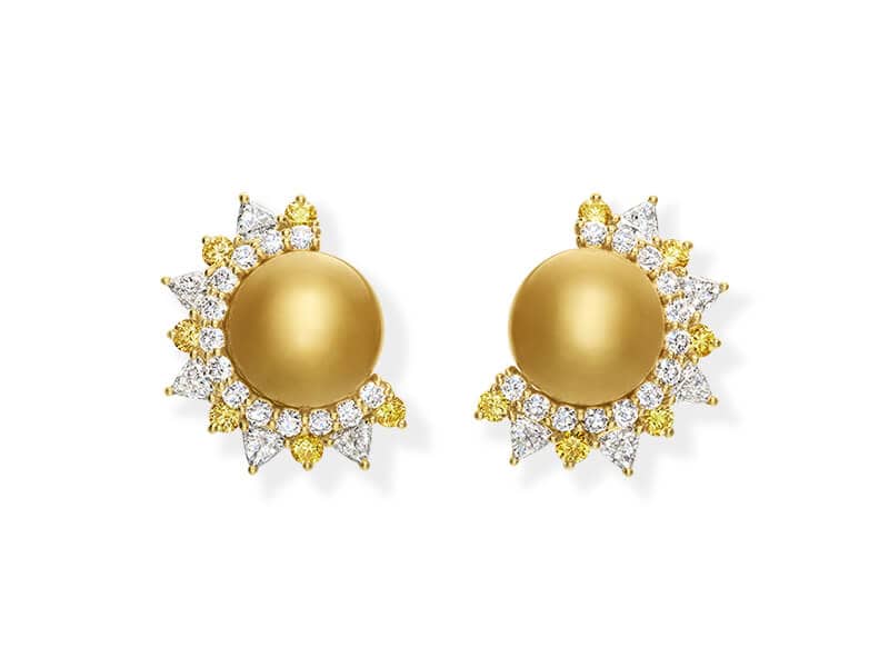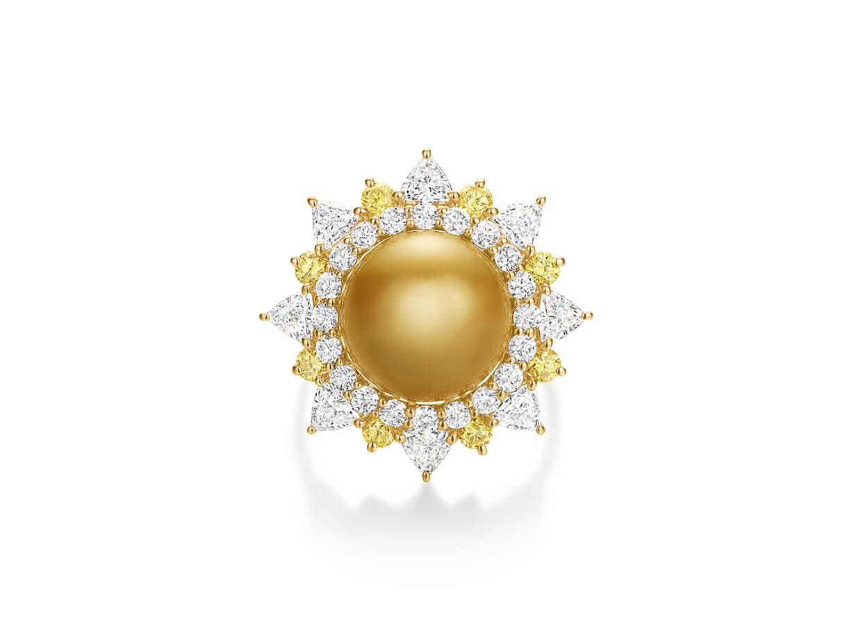 With a luminous 11.74 carat round golden South Sea pearl at its center, the jewel is framed by a halo of yellow and colorless diamonds, all set in 18k yellow gold to evoke the warmth and brilliance of dawn.
