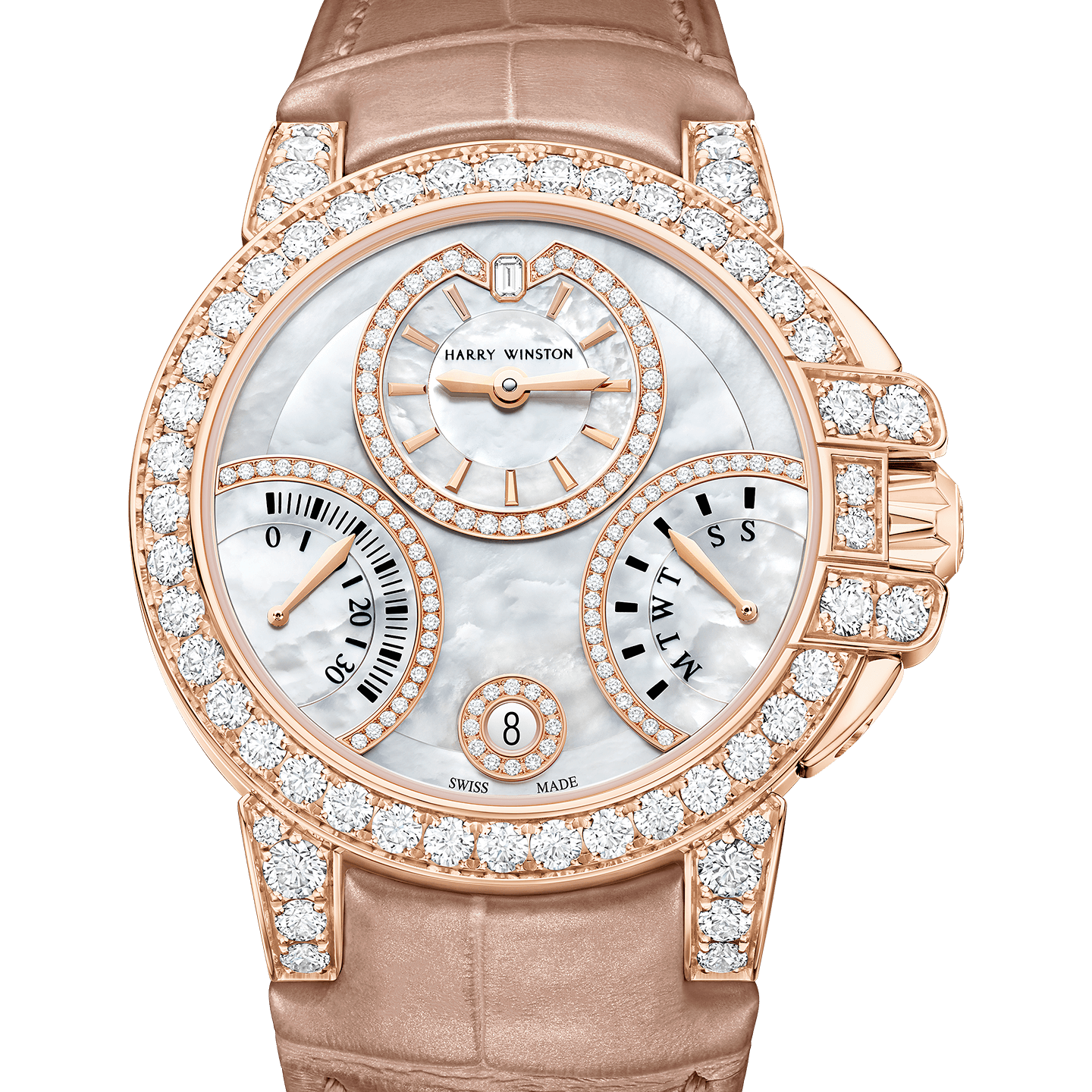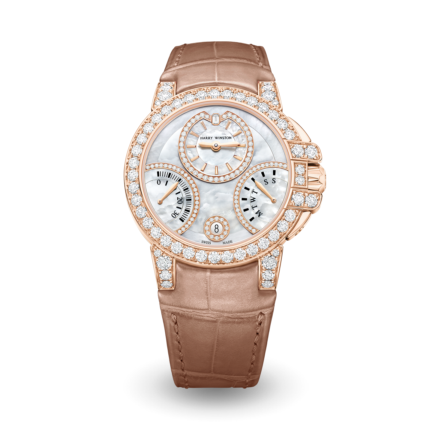 Harry Winston’s Ocean timepiece collection welcomes a white Biretrograde model into the sporty yet elegant series. Mother-of-pearl dial mingle with round brilliant diamonds in an 18-karat gold case. A winning combination of resilience, sophistication and impressive retrograde complications, this iteration is the essence of versatility.