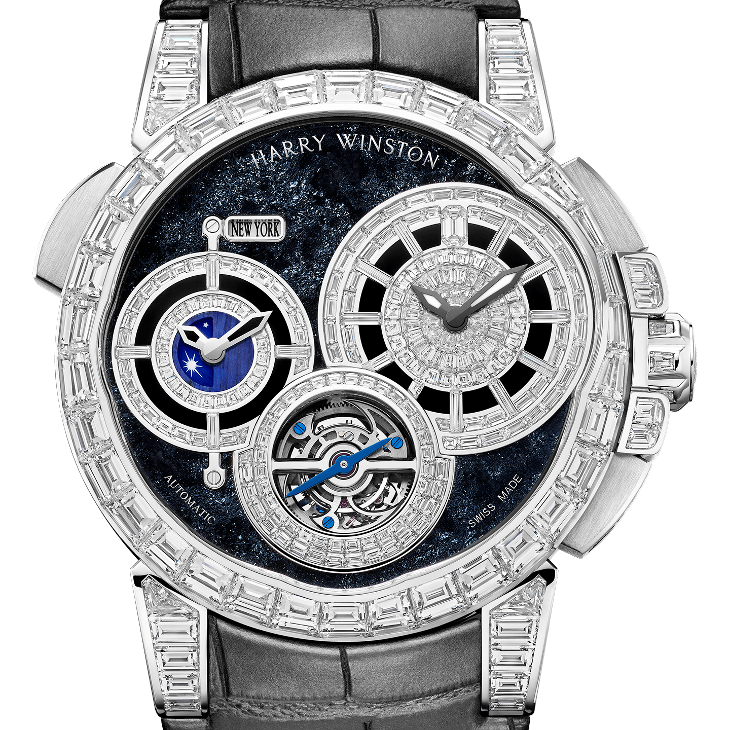 Harry Winston presents a timepiece that navigates the high seas of horological complications and the exquisite world of high jewelry. Limited to just five pieces, the Ocean Tourbillon GMT Worldtimer is equipped with a GMT function displaying two time zones simultaneously. Harry Winston’s gem-setters have created a masterpiece with 388 gleaming diamonds invisibly set and powered by a mesmerizing tourbillon.