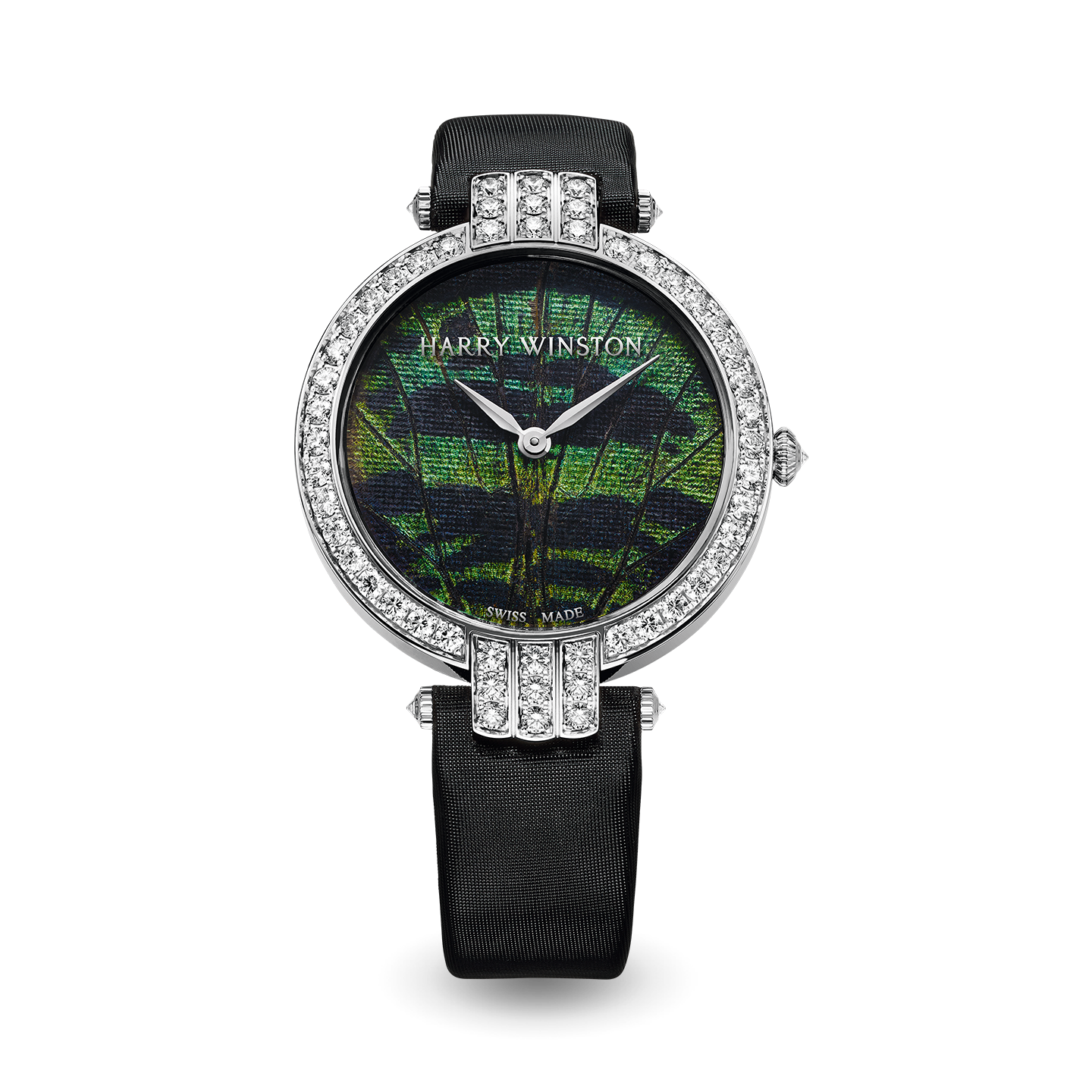 The House of Harry Winston continues exploring unexpected pairings and use highly original technique. The material chosen for this model is brimming with emotions and symbolism. The vibrant colors adorning the Premier Precious Butterfly timepieces are created using the fragile, yet extraordinarily iridescent, powder found on butterfly wings.