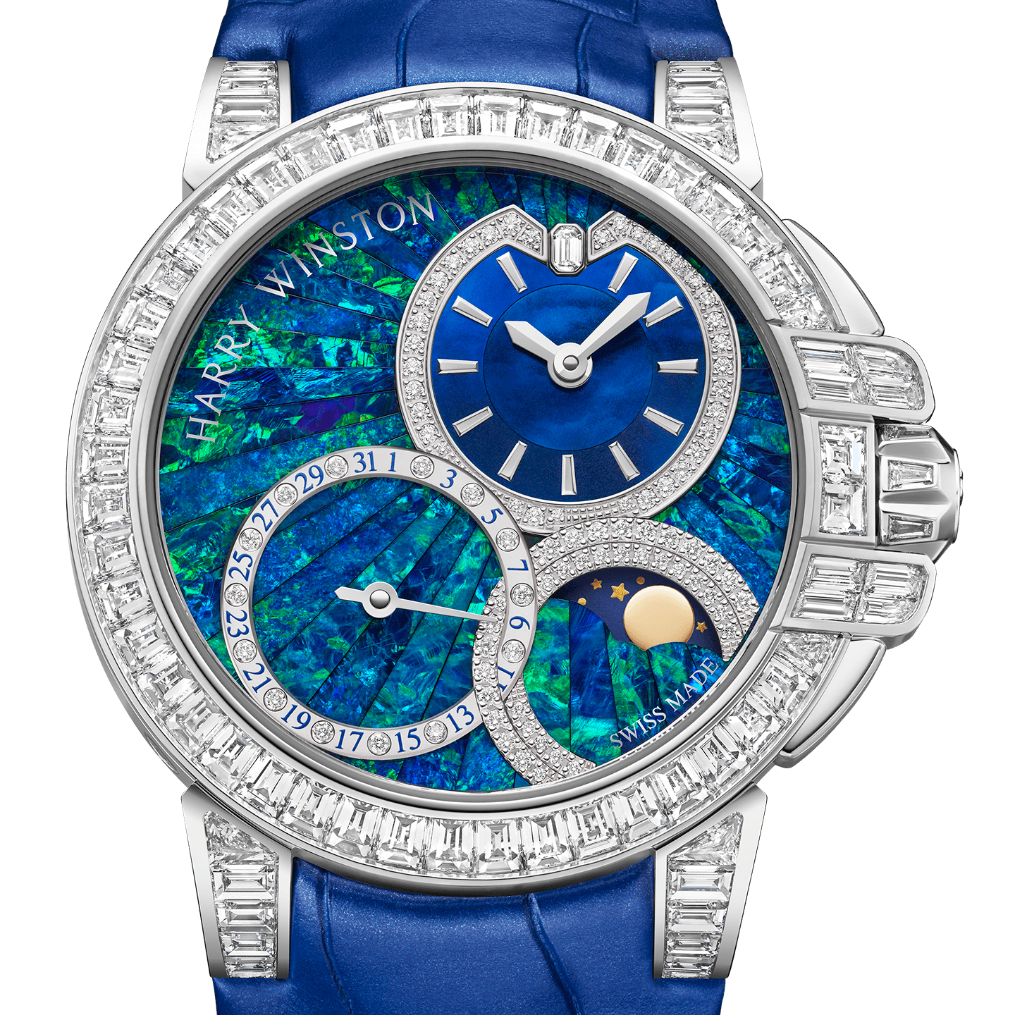 Harry Winston unveils a timepiece from its Ocean Collection with a mesmerizing opal dial and an intense sparkle of diamonds. Limited to just five pieces, the Ocean Date Moon Phase Automatic 36mm features Australian Blue Opal Crystal, the rarest and most valuable type of precious opals. Employing the delicate and refined art of stone marquetry, the craftsmanship behind this dial is a testament to the skill of Harry Winston’s artisans. This timepiece is an open invitation to navigate the seas.