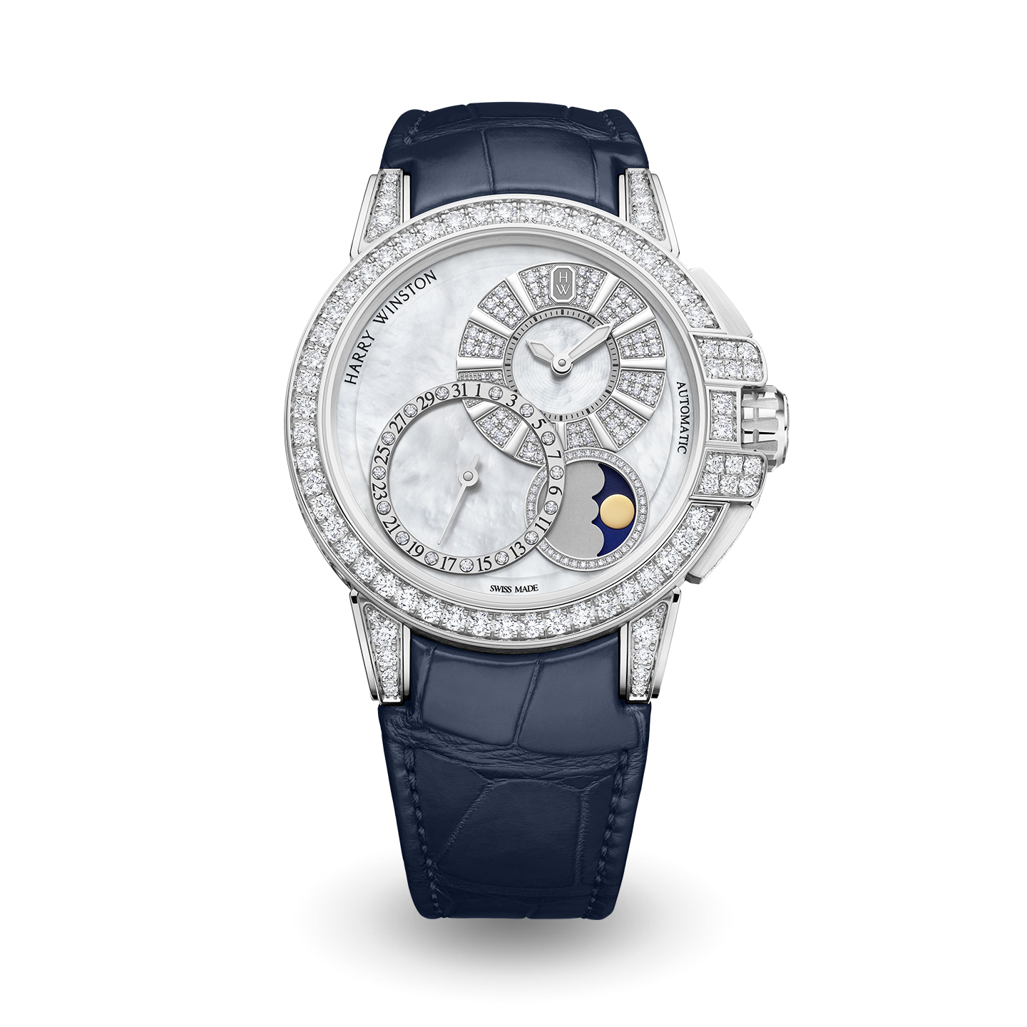 The House of Harry Winston unveils an Ocean timepiece with an entirely new dial configuration. Continuing to uphold the principles of the Ocean collection, the latest model alters its course and offers a captivating asymmetrical layout for the phases of the moon, the time and the date. Embellished with shimmering mother-of-pearl and a sea spray of diamonds, the Ocean Date Moon Phase is destined to become a classic.