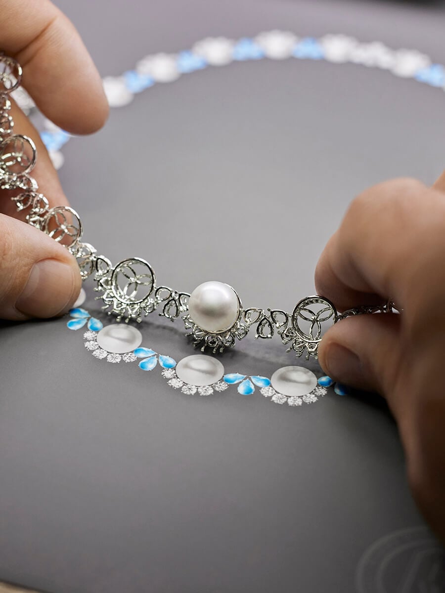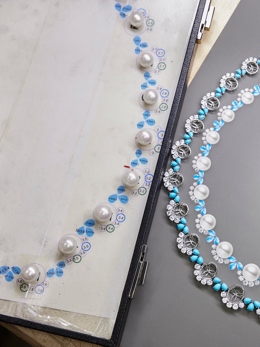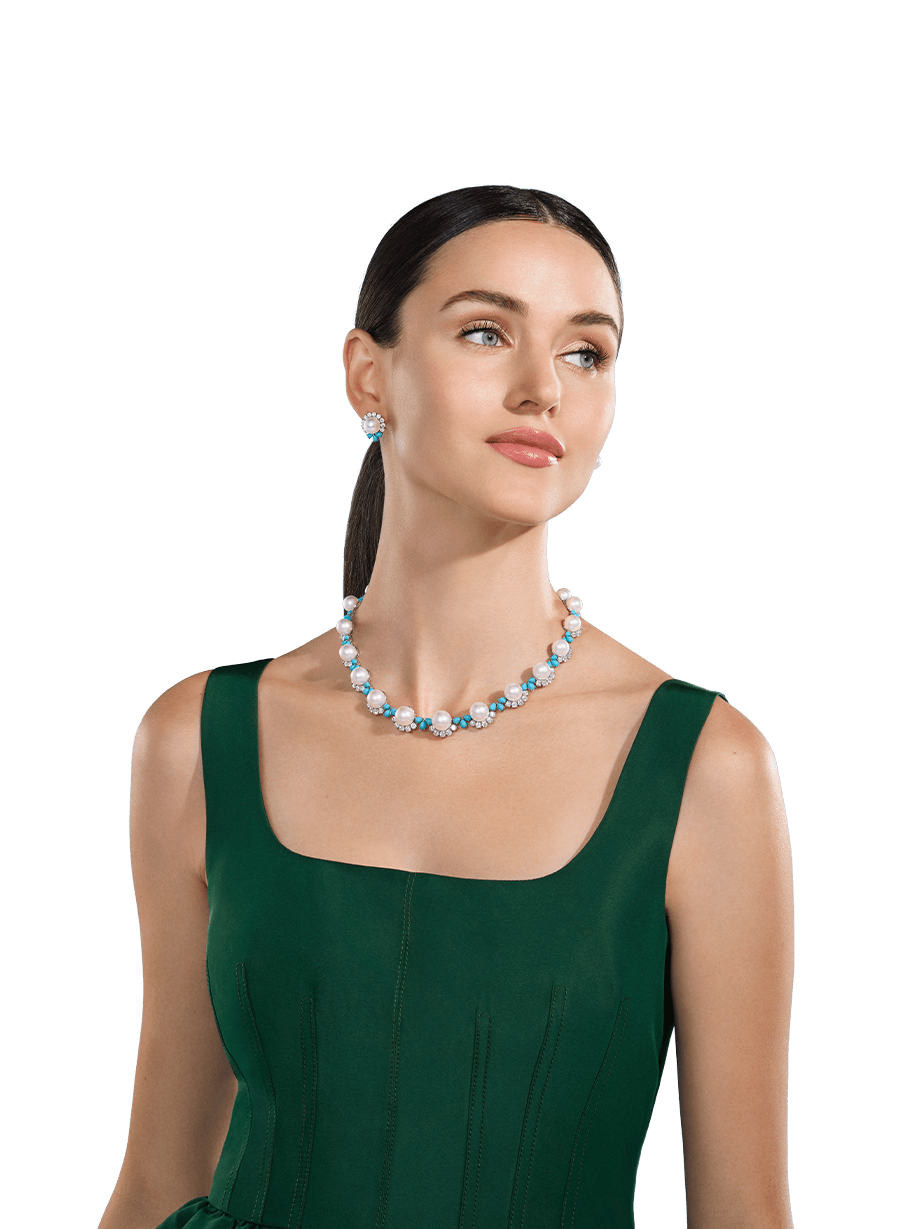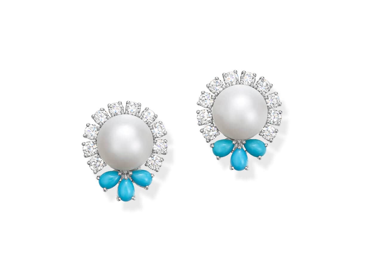 White South Sea pearls weighing 7.41 carats each are illuminated by a halo of brilliant diamonds and pear-shaped turquoise cabochons.