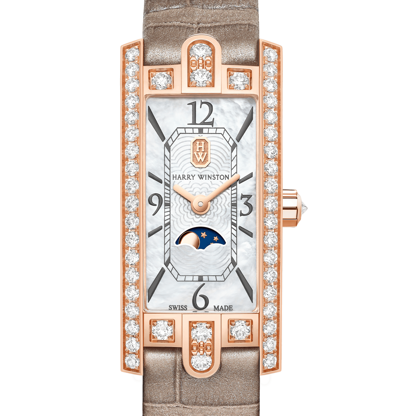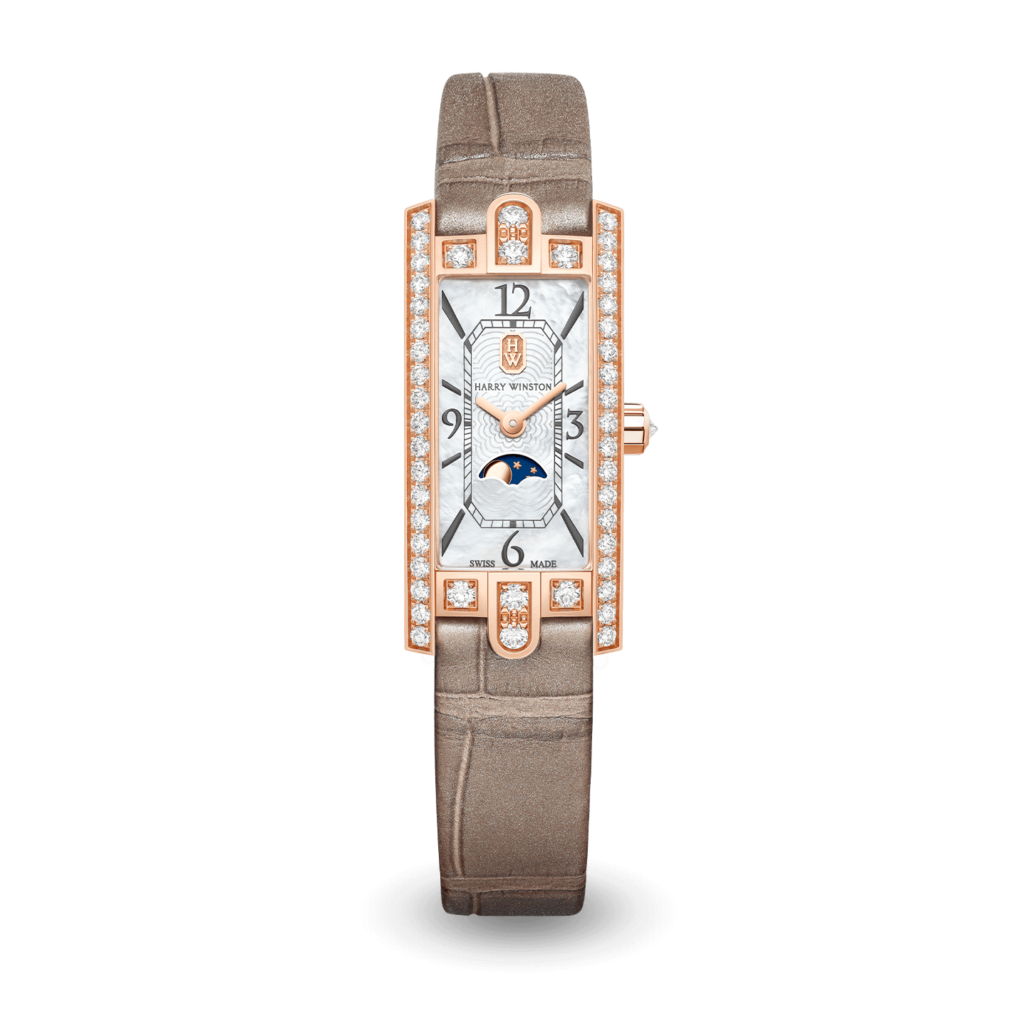 The Avenue Collection pays tribute to the elegant geometry of the Art Deco period when the House of Harry Winston was founded in New York. Equipped with a poetic moon phase complication, in its pearly heart, the Avenue C Mini Moon Phase timepiece recalls the House’s illustrious past, while also looking to the future of its brilliant universe.