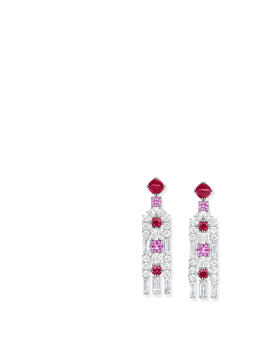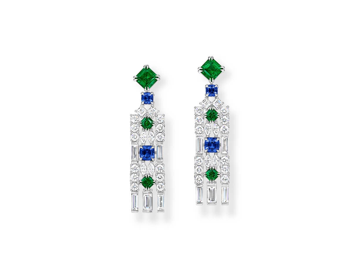 Meticulously crafted from emeralds, sapphires, and diamonds in a geometric arrangement, this pair of Brownstone Earrings echoes the distinctive facades of New York’s historic residences, accenting the ears with their same stately splendor.
