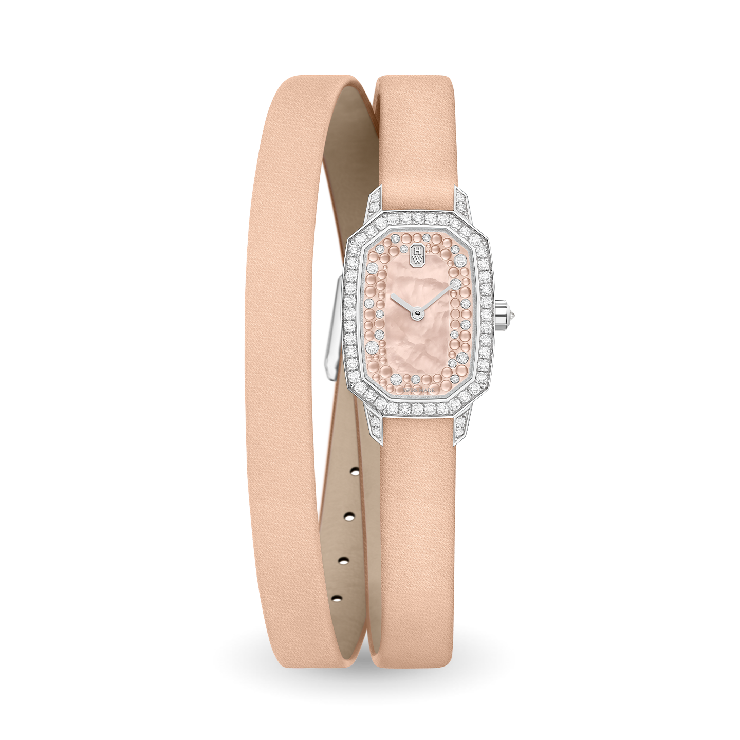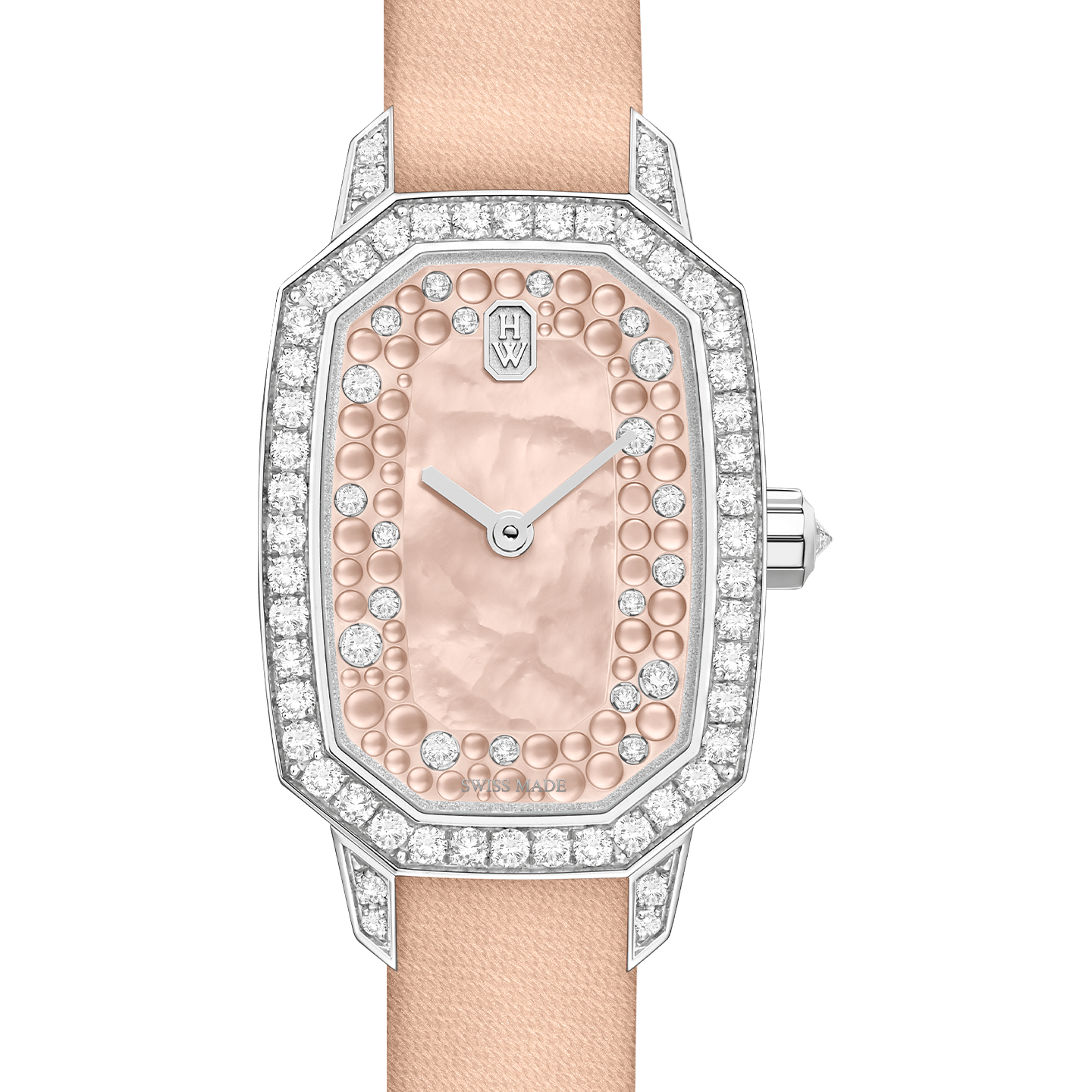 A new palette of captivating colors enriches Harry Winston’s sophisticated Emerald collection. With a winning combination of iridescent mother-of-pearl and icy diamonds, the dial of this Emerald timepiece delights with colorful cabochon adornments.