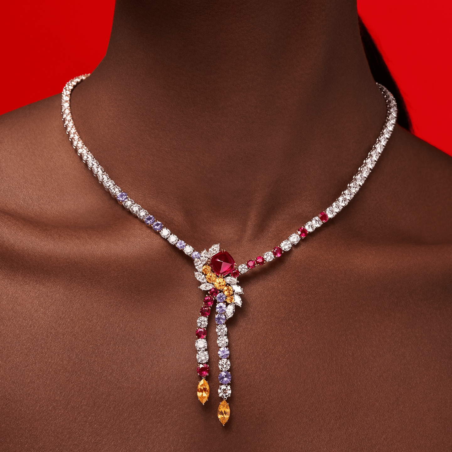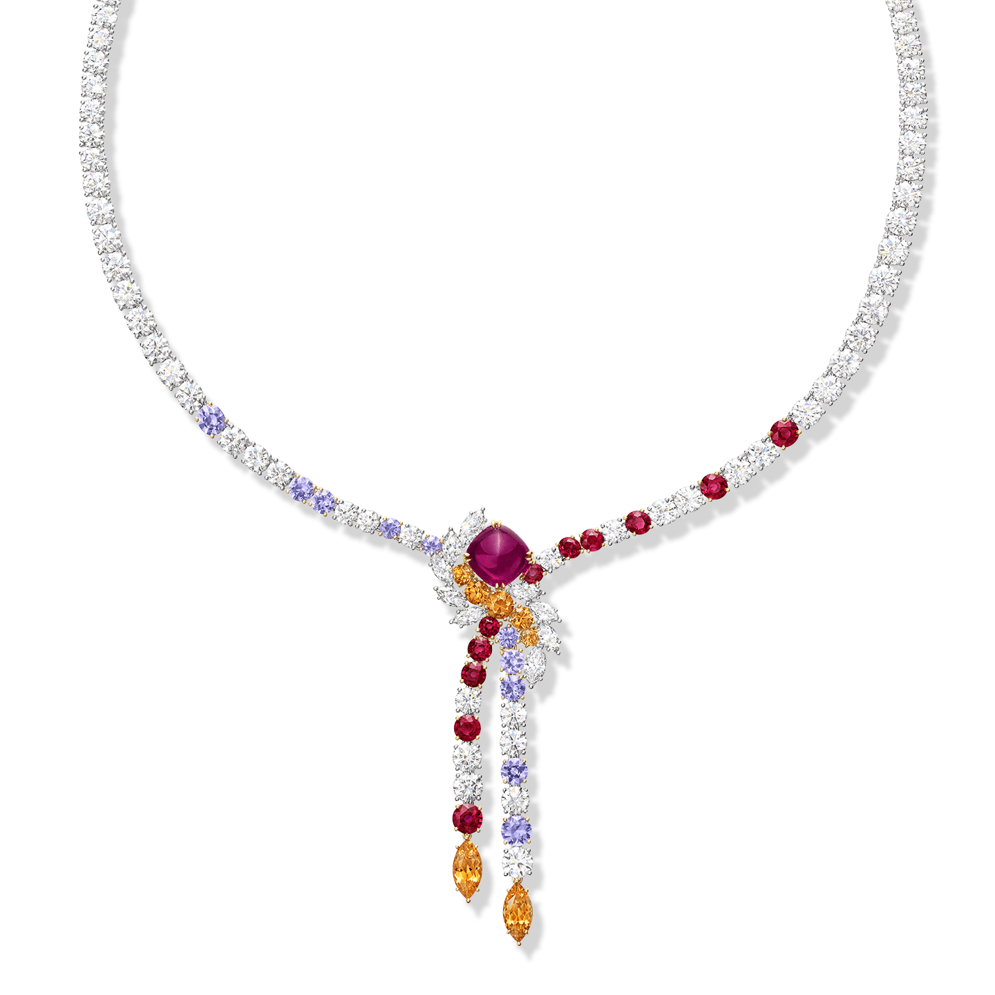 This captivating ruby necklace is vibrant with remarkable gems that express fluid, graceful movement. A festival of fascinating colors, it symbolizes fiery passion with a 5.02 carat sugar loaf ruby with 11 round rubies weighing a total of approximately 3.72 carats, 10 round purple sapphires weighing a total of approximately 3.33 carats, 8 round and 2 marquise spessartite garnets weighing a total of approximately 4.73 carats, and 97 round brilliant and 15 marquise diamonds weighing a total of approximately 24.37 carats. Set in platinum and 18K yellow gold.
