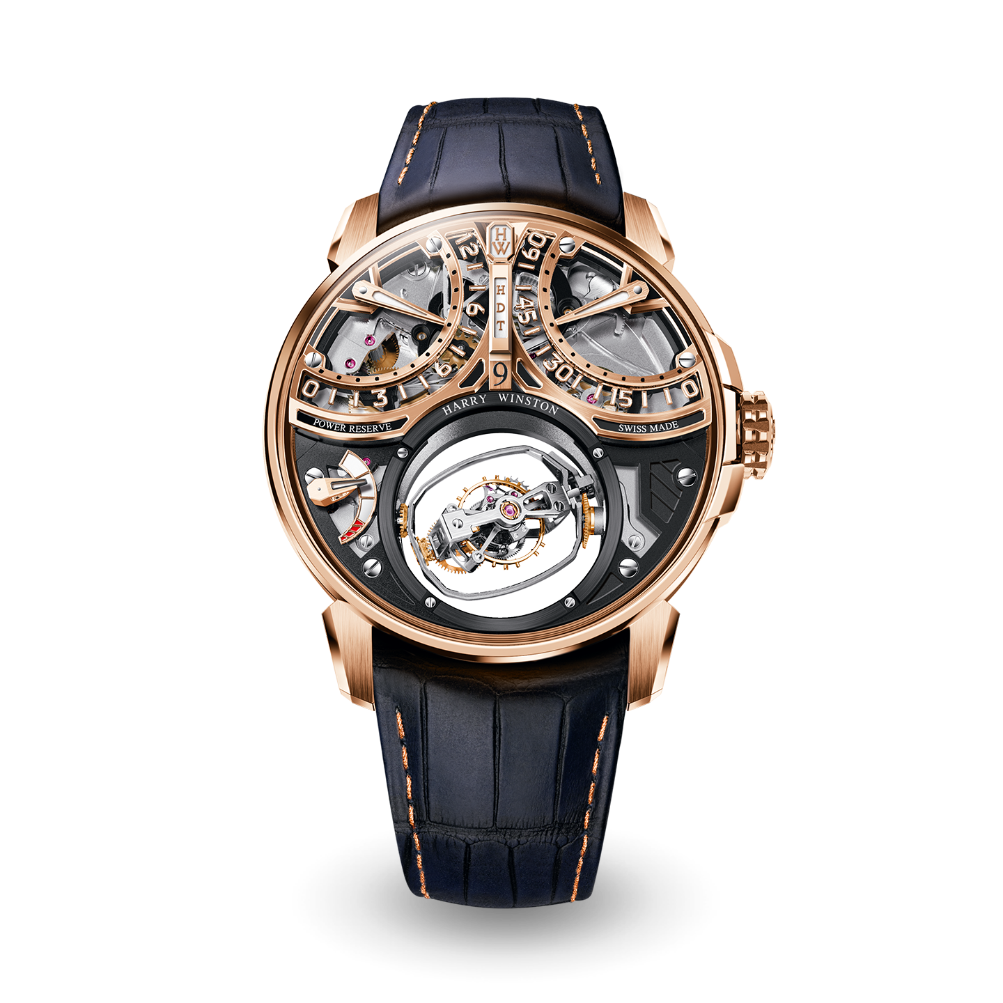 True to the highly mechanical and skeletonized style of Harry Winston’s grand complications, Histoire de Tourbillon 9 plays with volume, symmetry, and transparency, following principles of design that break with convention. Casting a new light on fine watchmaking innovation, its triaxial tourbillon has been augmented with retrograde jumping hours and retrograde minutes.