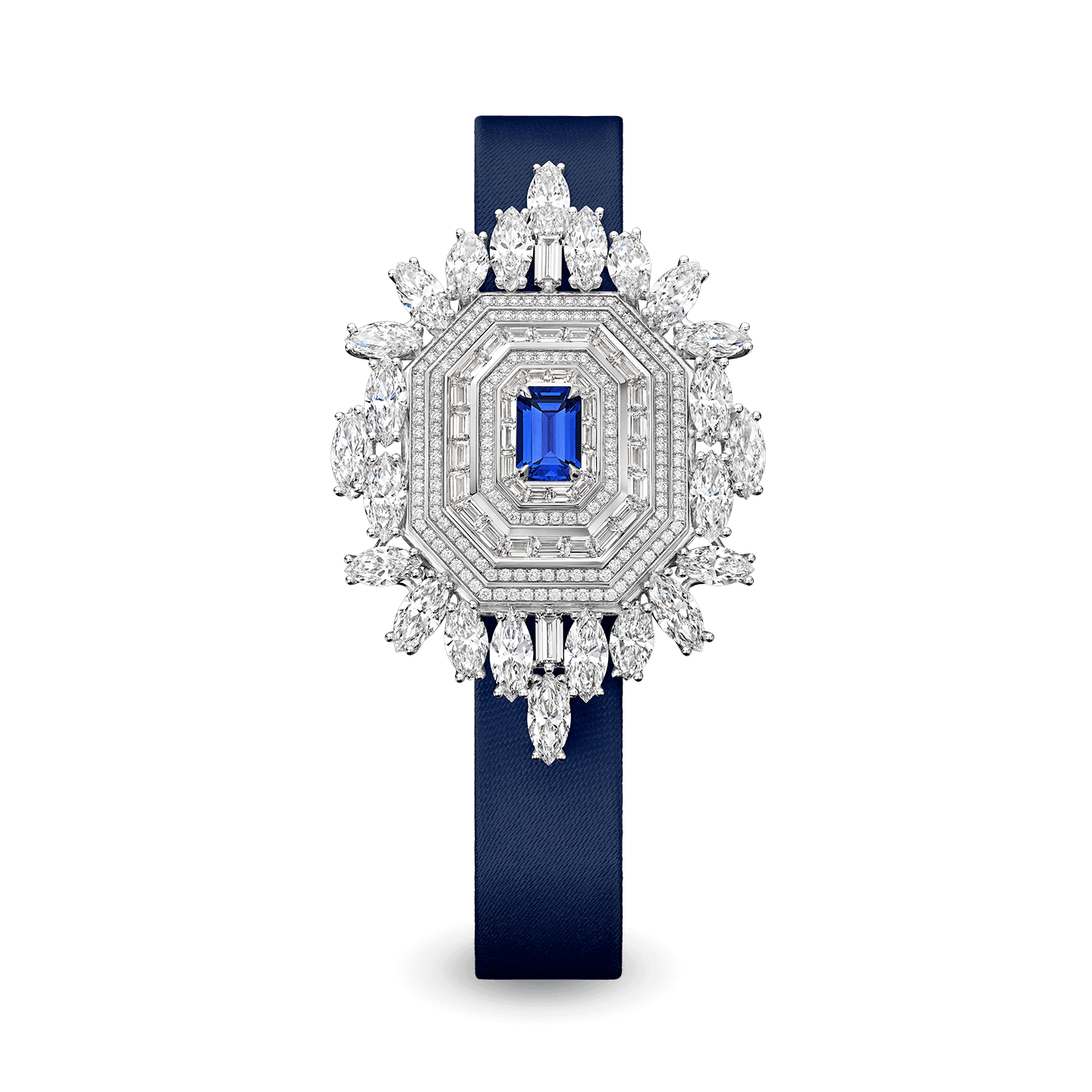 The Ultimate Emerald Signature is the brightest star in the constellation of Harry Winston’s High Jewelry Timepieces collection. In 2021, a new version of the Ultimate Emerald Signature with blue sapphires joins the series. The ultimate accessory for glamorous red carpet occasions, the versatile design means the timepiece can be worn around the wrist, around the neck as a pendant or even as a brooch.