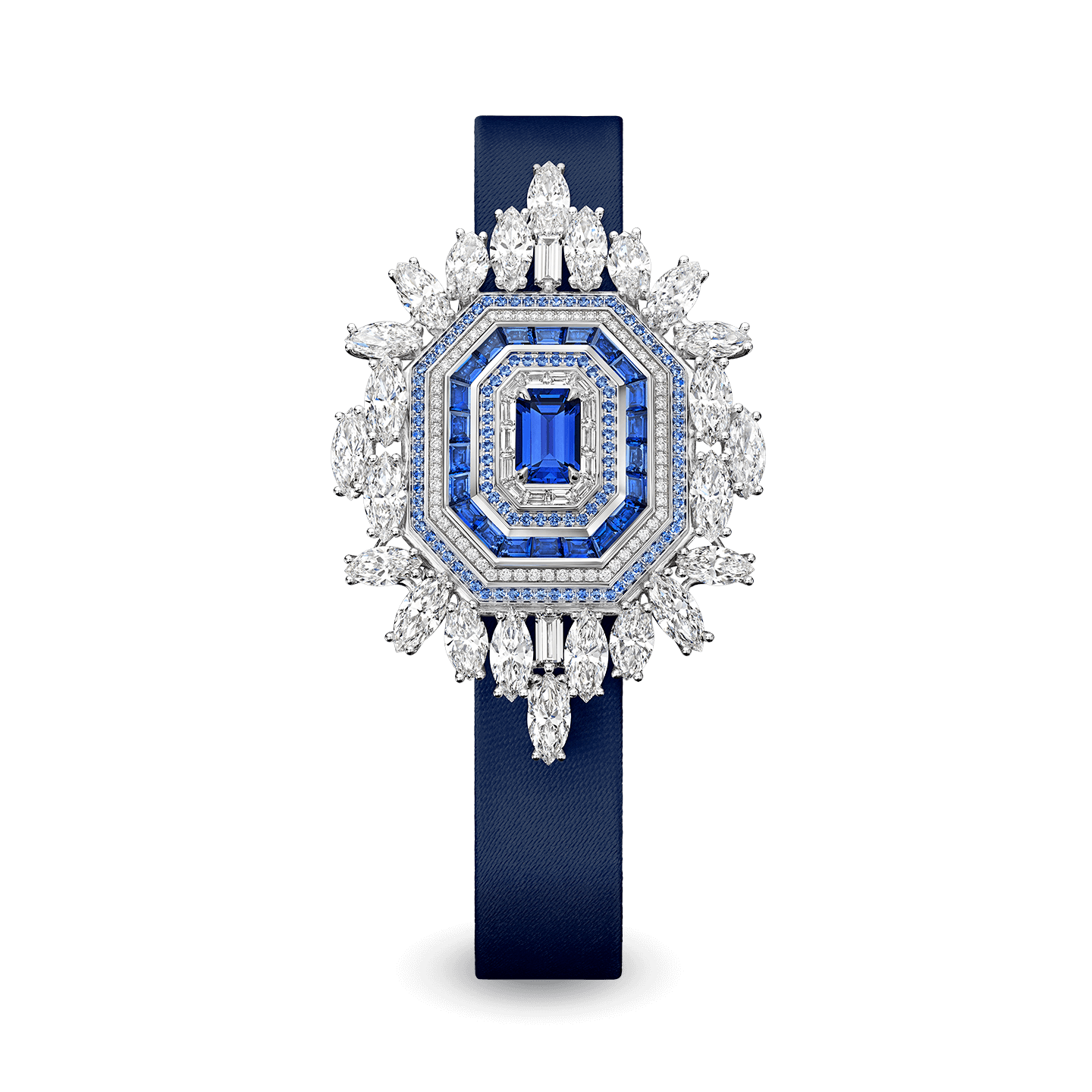 The Ultimate Emerald Signature is the brightest star in the constellation of Harry Winston’s High Jewelry Timepieces collection. In 2021, a new version of the Ultimate Emerald Signature with blue sapphires joins the series. The ultimate accessory for glamorous red carpet occasions, the versatile design means the timepiece can be worn around the wrist, around the neck as a pendant or even as a brooch.