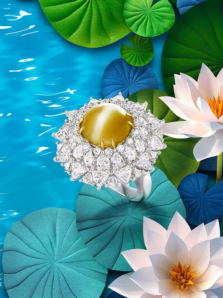 An exceptional 6.64 carat emerald takes center stage in this breathtaking creation, its vivid hue nodding to nature’s lush beauty. Encircled by tiers of fancy-shaped diamonds, the one-of-a-kind ring exquisitely resembles a flower in bloom.