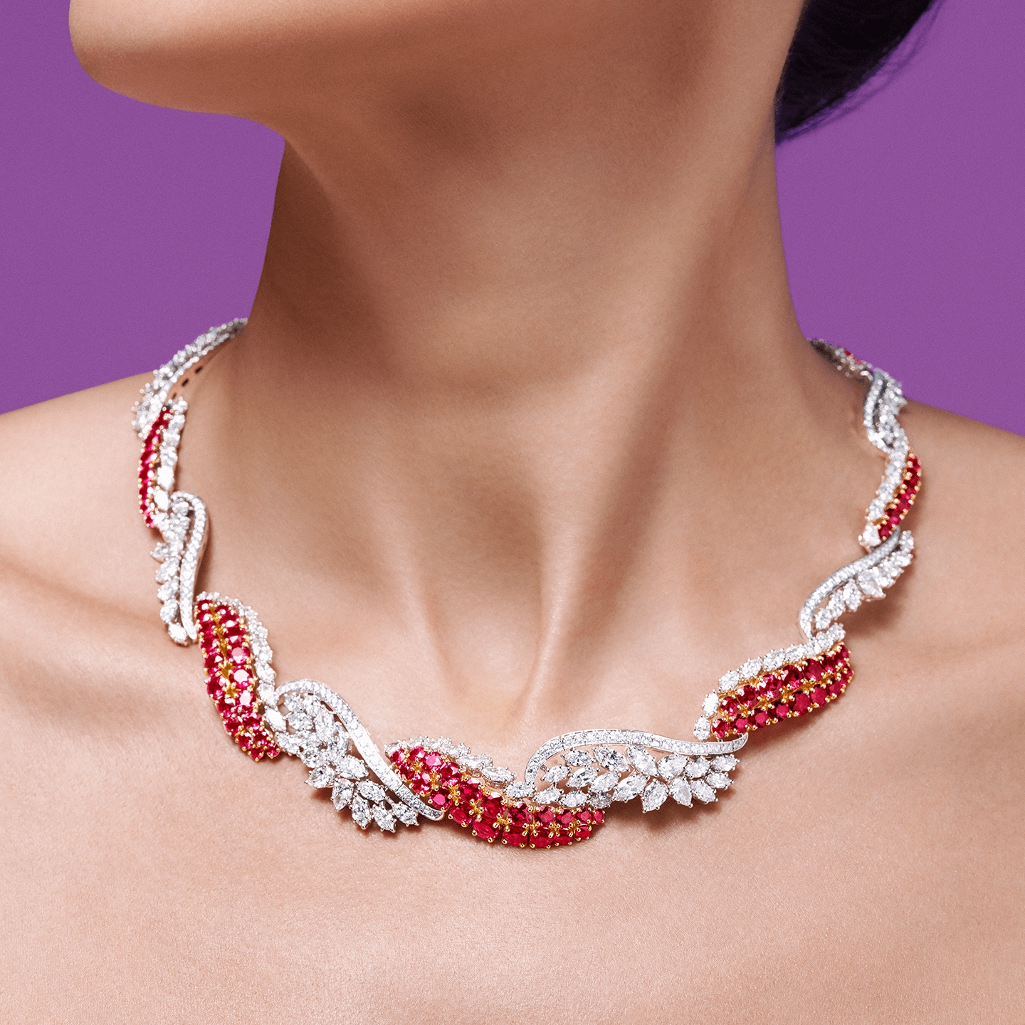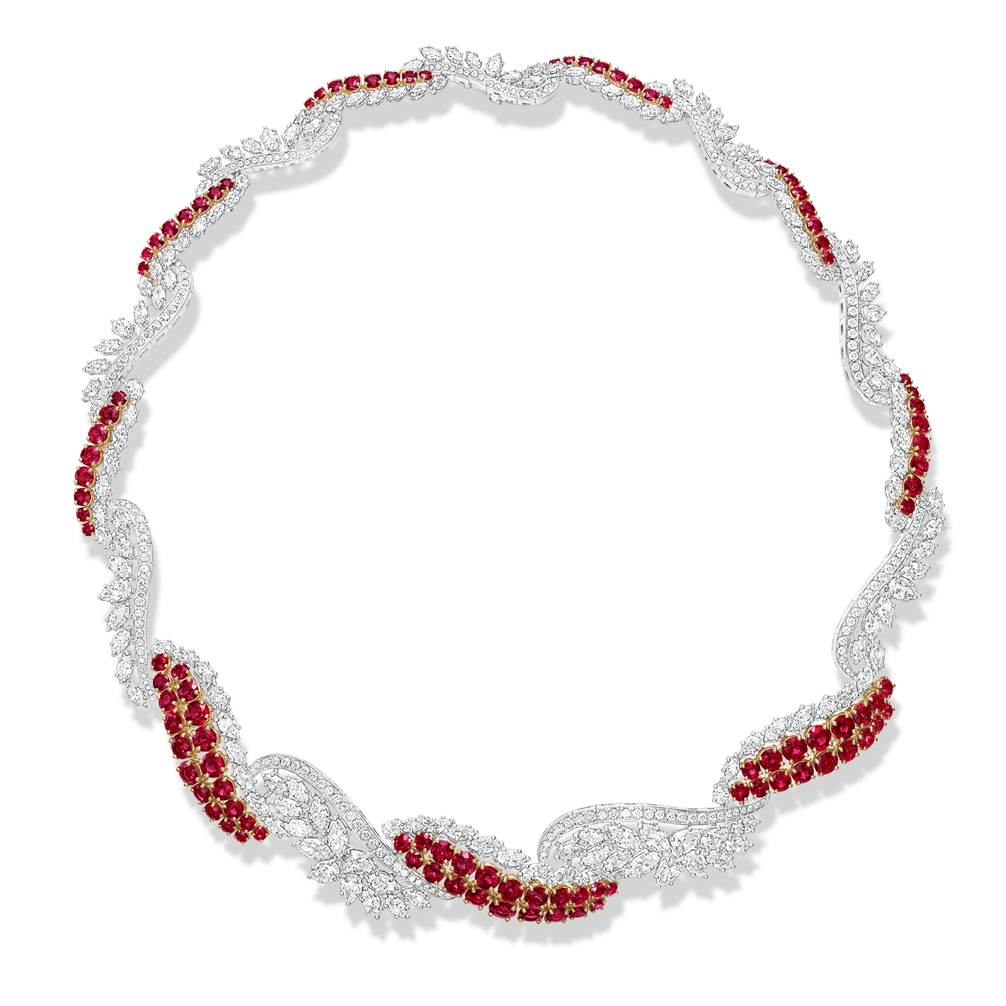 Adapted from an archival Winston design, this diamond and ruby necklace has a signature twist motif. A perfect representation of the intertwining of two souls, it magnificently frames the neck with 104 round rubies weighing a total of approximately 24.28 carats and 190 round brilliant, 133 marquise, and 22 pear-shaped diamonds weighing a total of approximately 24.70 carats, set in platinum and 18K rose gold.