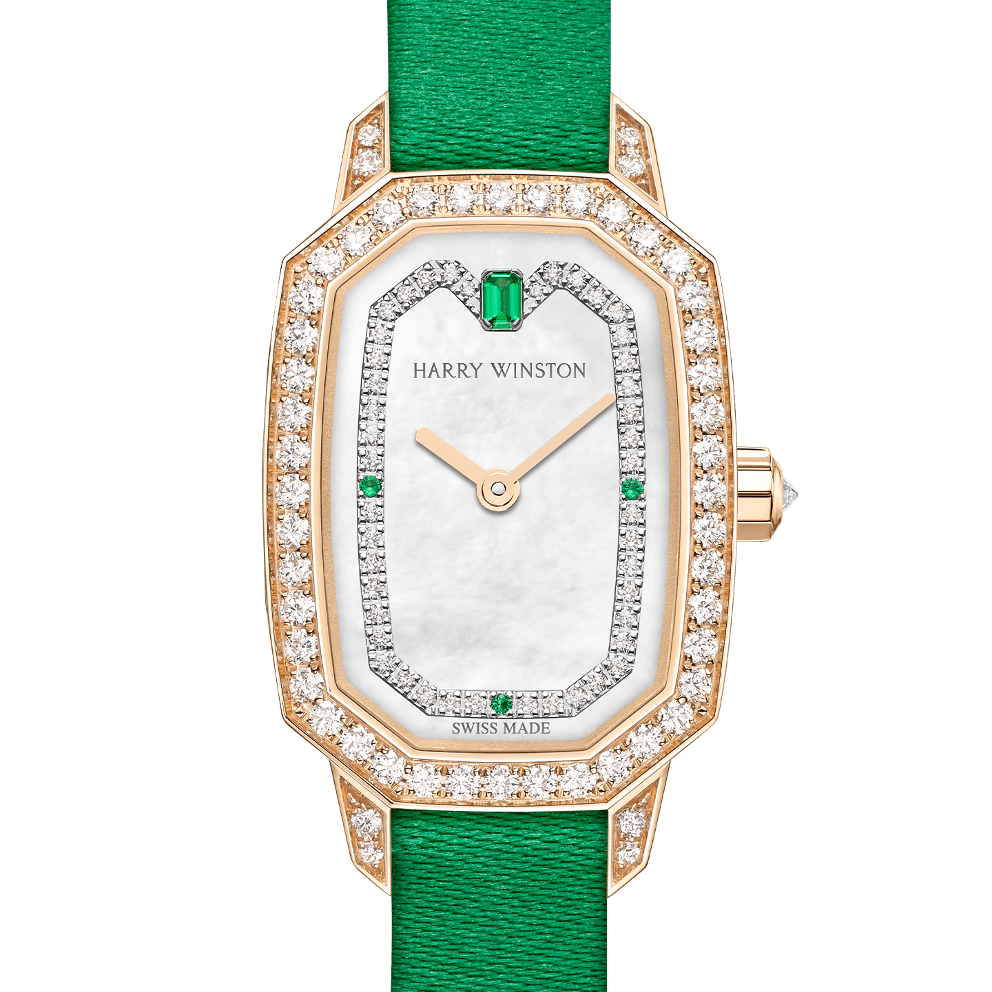 Adorned with intense green tones, diamonds and mother-of-pearl, the Harry Winston Emerald is the perfect luxury accessory for women who want both the practicality of a timepiece and the hallmark glamour of Harry Winston jewels.