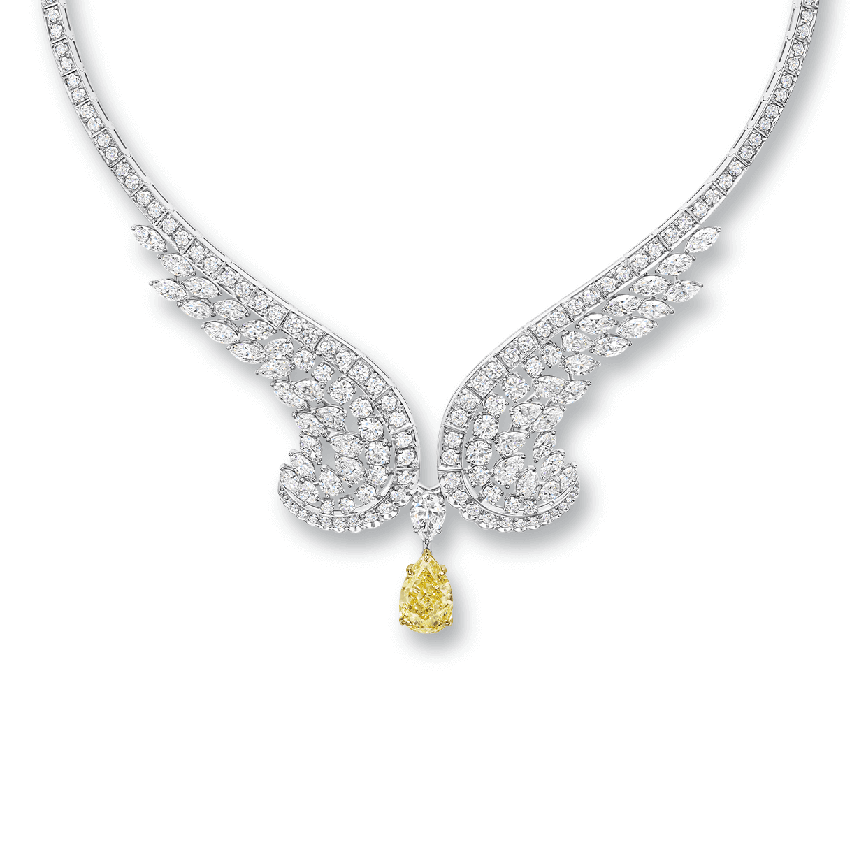 這款非凡的頂級珠寶項鍊散發著紐約代表性天際線的輝煌,以藍寶石、沙弗萊石、黃鑽、祖母綠和鑽石鑲嵌於明亮的鉑金中,令人著迷