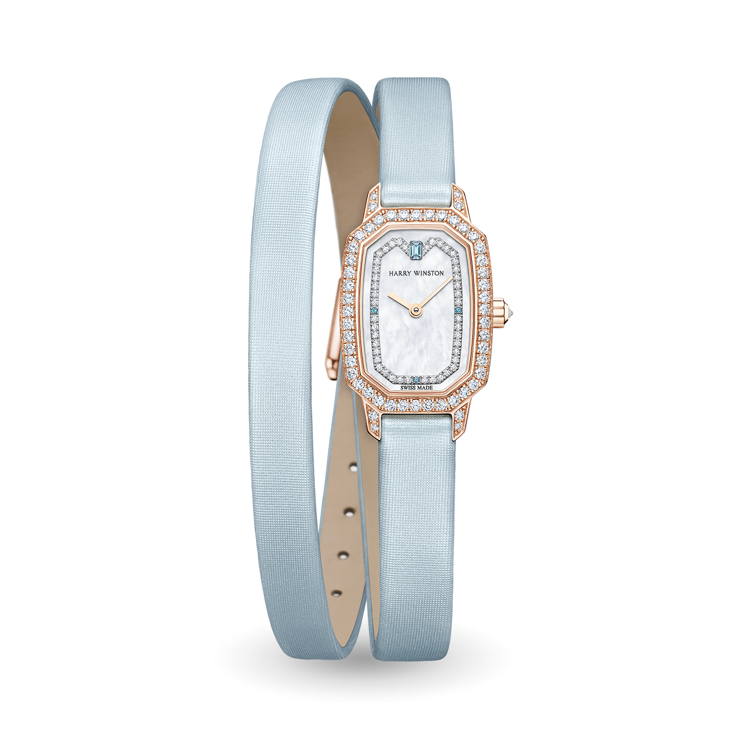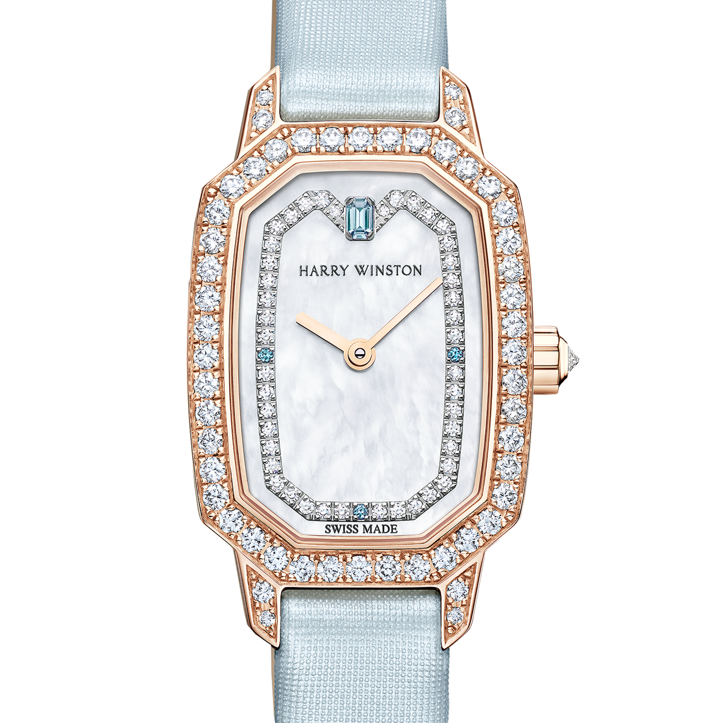 Adorned with soft blue tones, diamonds and mother-of-pearl, the Harry Winston Emerald is the perfect luxury accessory for women who want both the practicality of a timepiece and the hallmark glamour of Harry Winston jewels.
