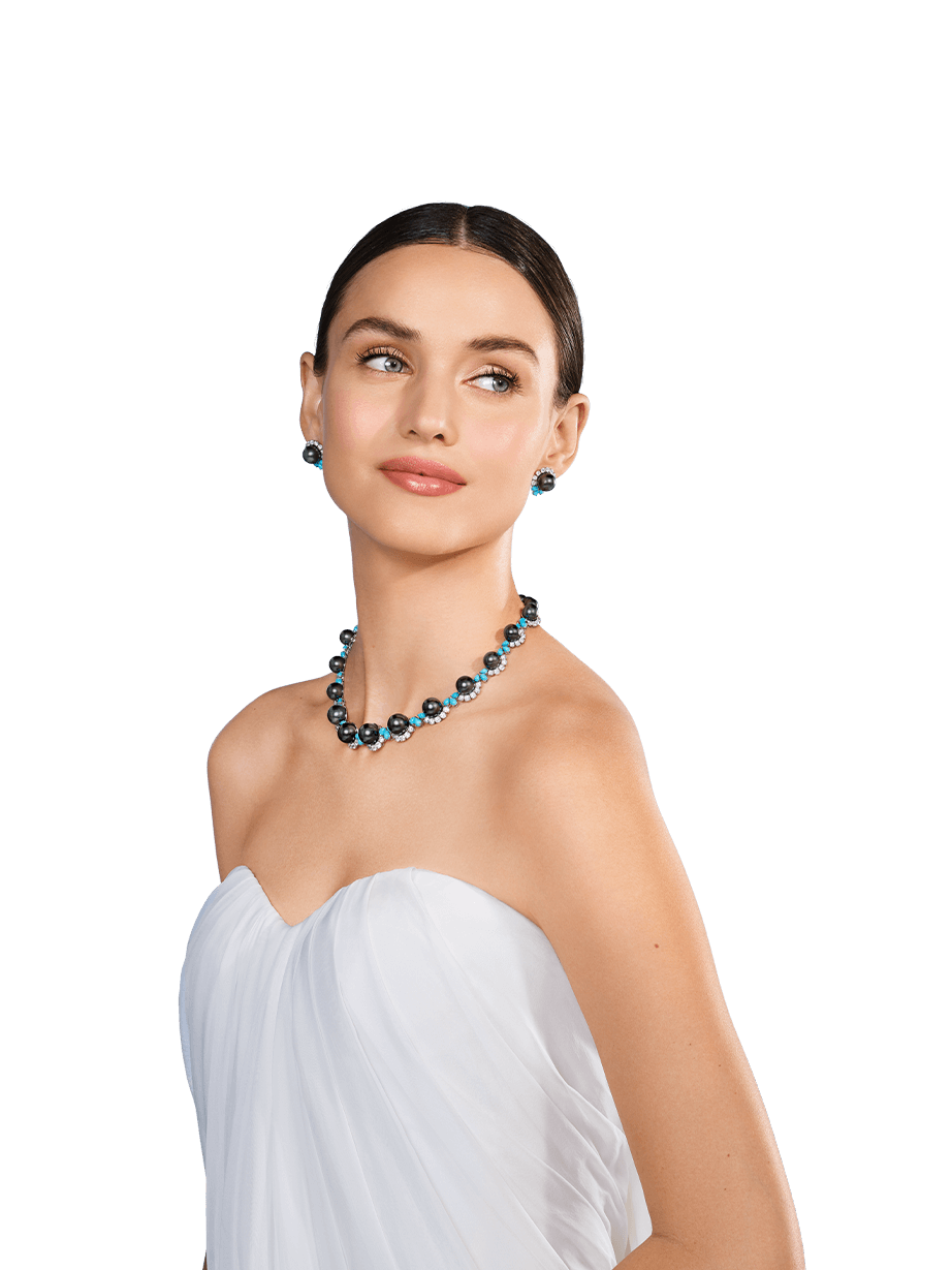 La beauté envoûtante de Tahiti prend vie dans une parure façonnée à partir de perles noires de Tahiti, magnifiquement rehaussées de diamants étincelants et de turquoises.