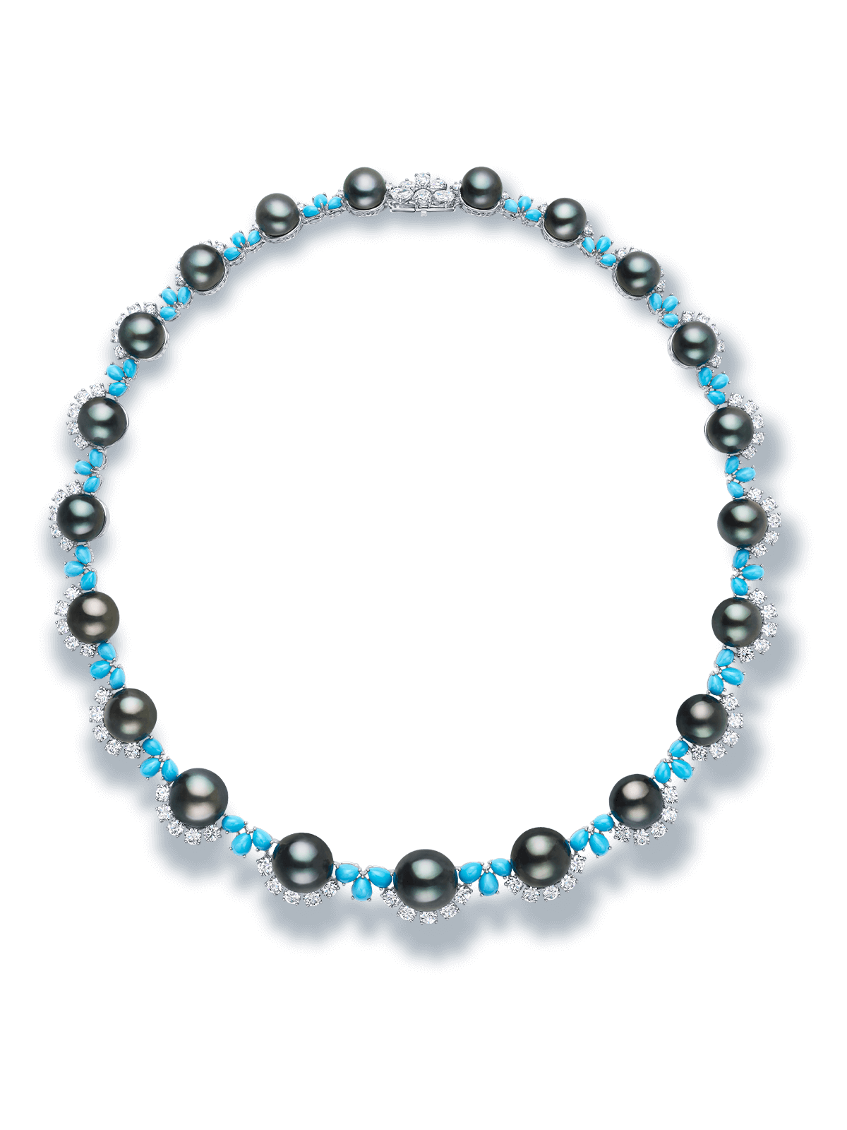 镶嵌珍稀大溪地黑珍珠、璀璨美钻和绿松石的高级珠宝套装栩栩如生地诠释出大溪地的迷人景致。
