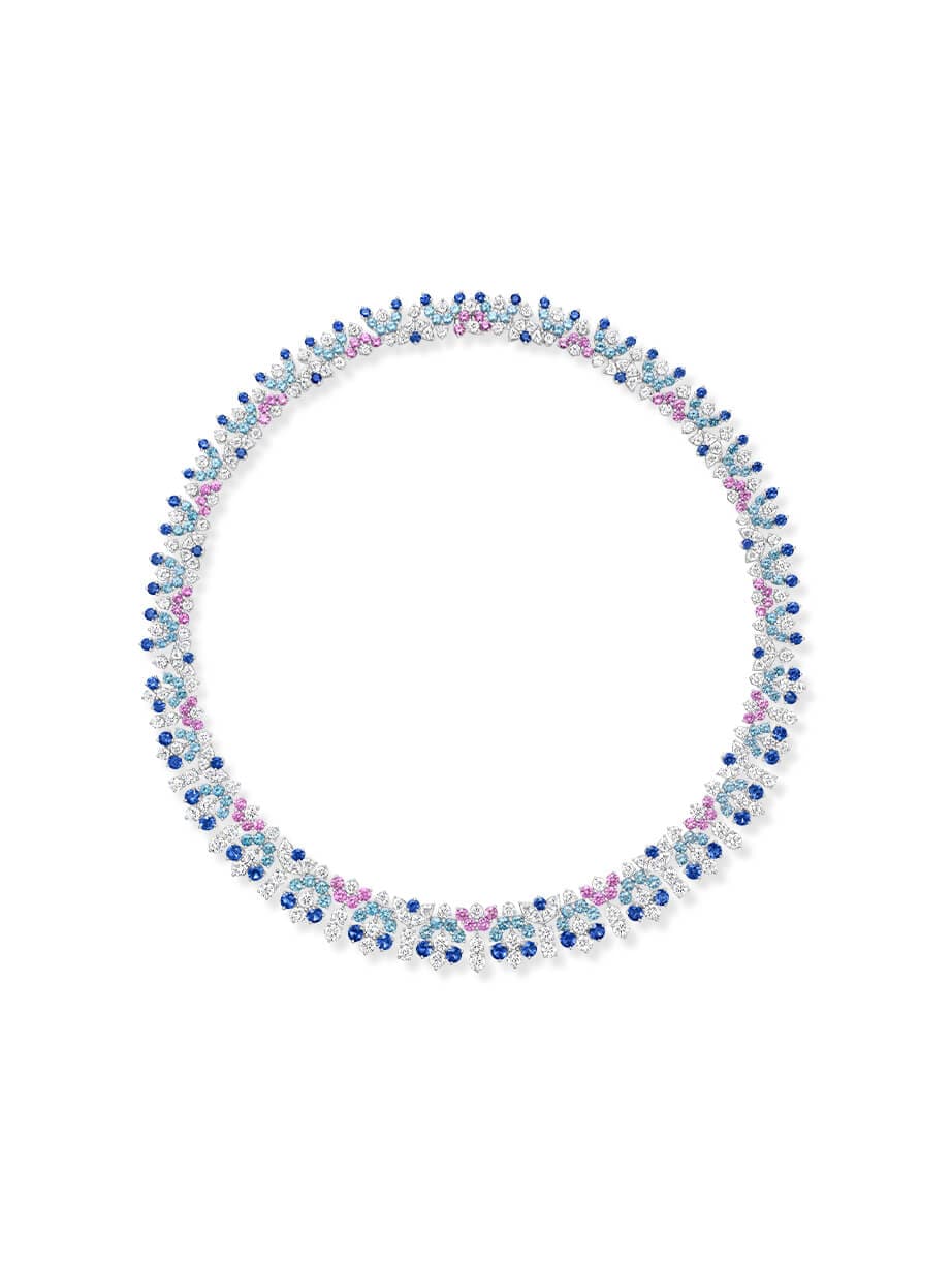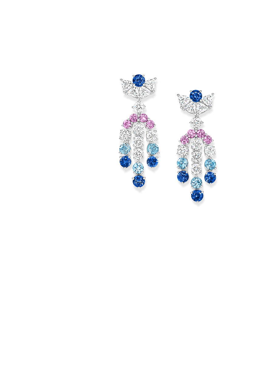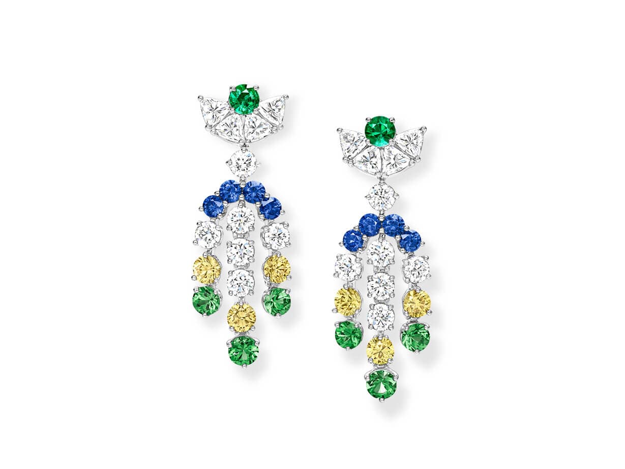 Like the iconic embellishments of the city's most celebrated facades, high jewelry earrings with sapphires, tsavorites, and diamonds bring geometric beauty to the wearer's ears.