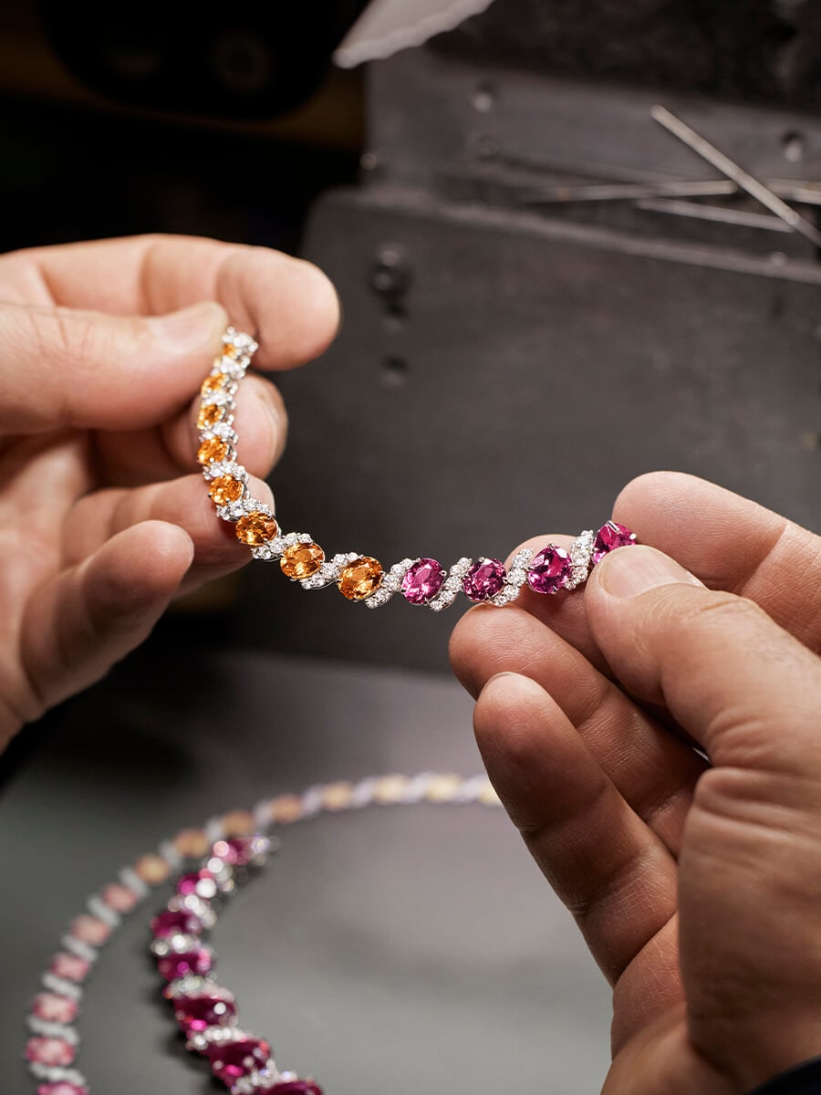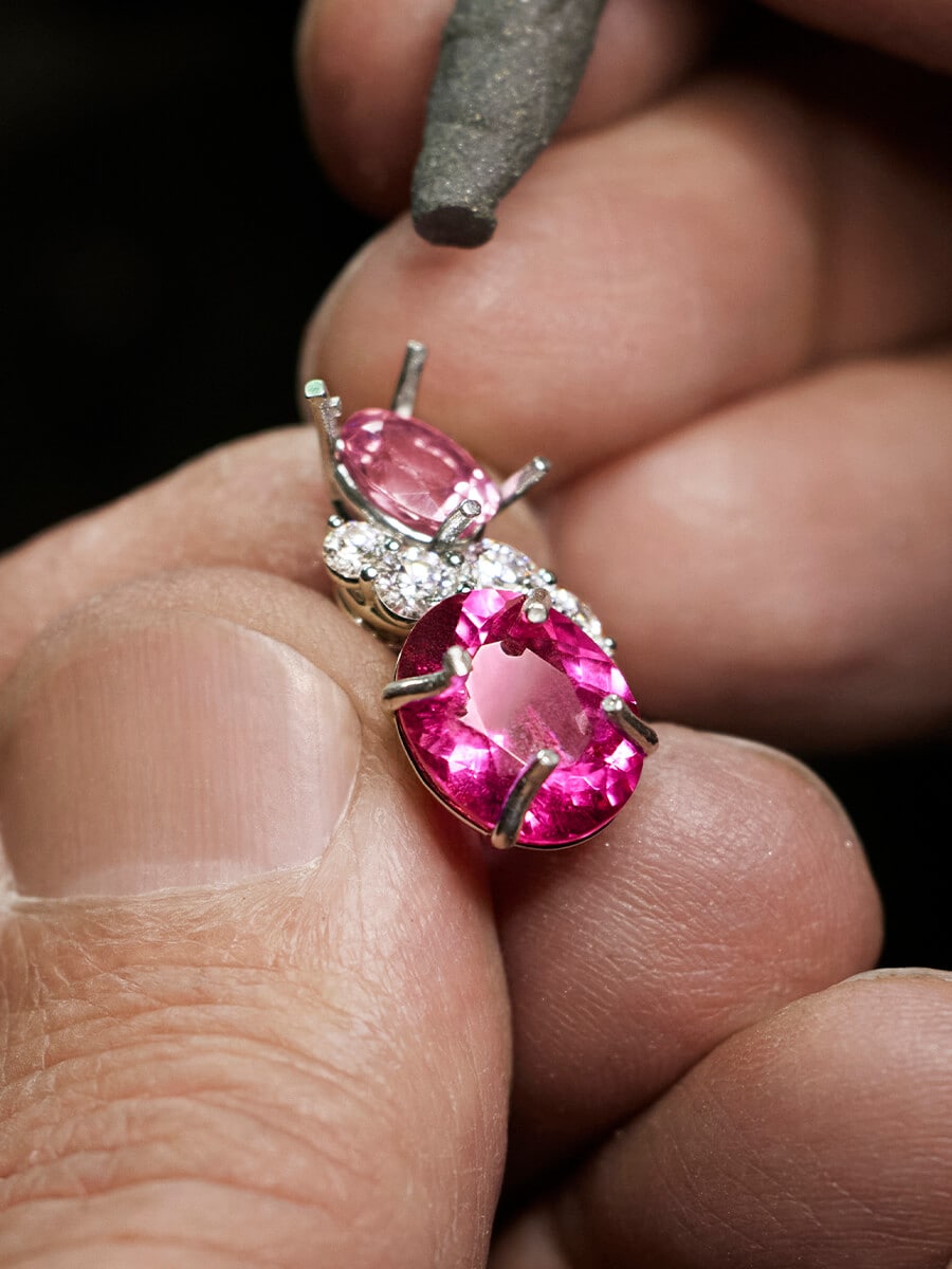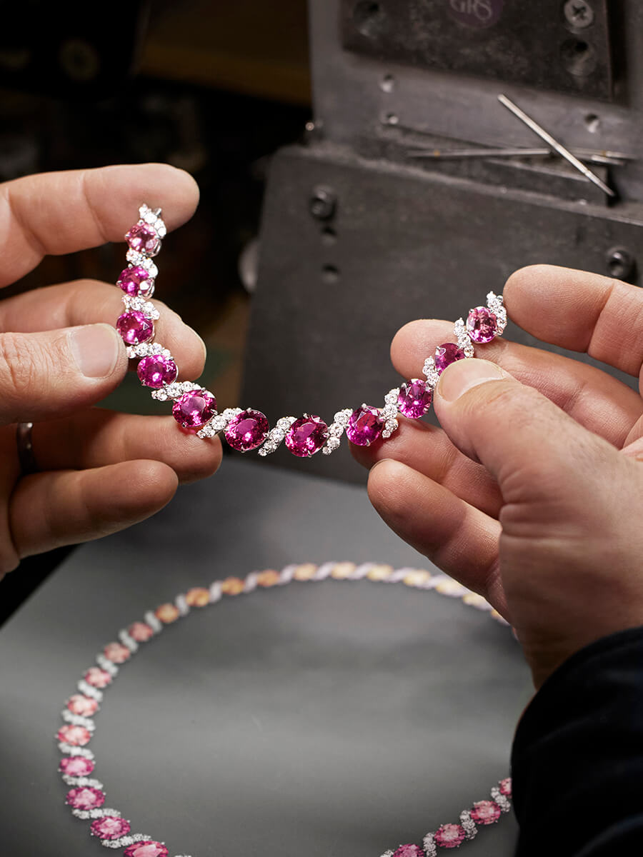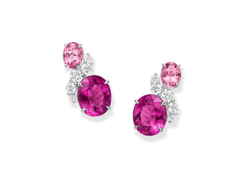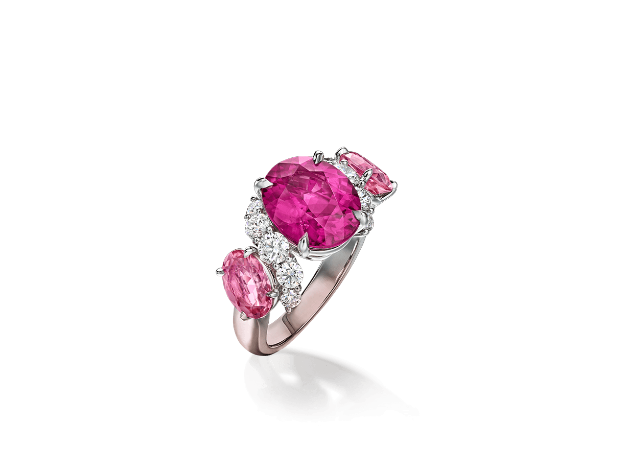 Surrounded by pink tourmalines and diamonds that sparkle with radiant brilliance, a 4.54 carat oval-shaped intense pink tourmaline center stone recalls the bold hues of twilight.