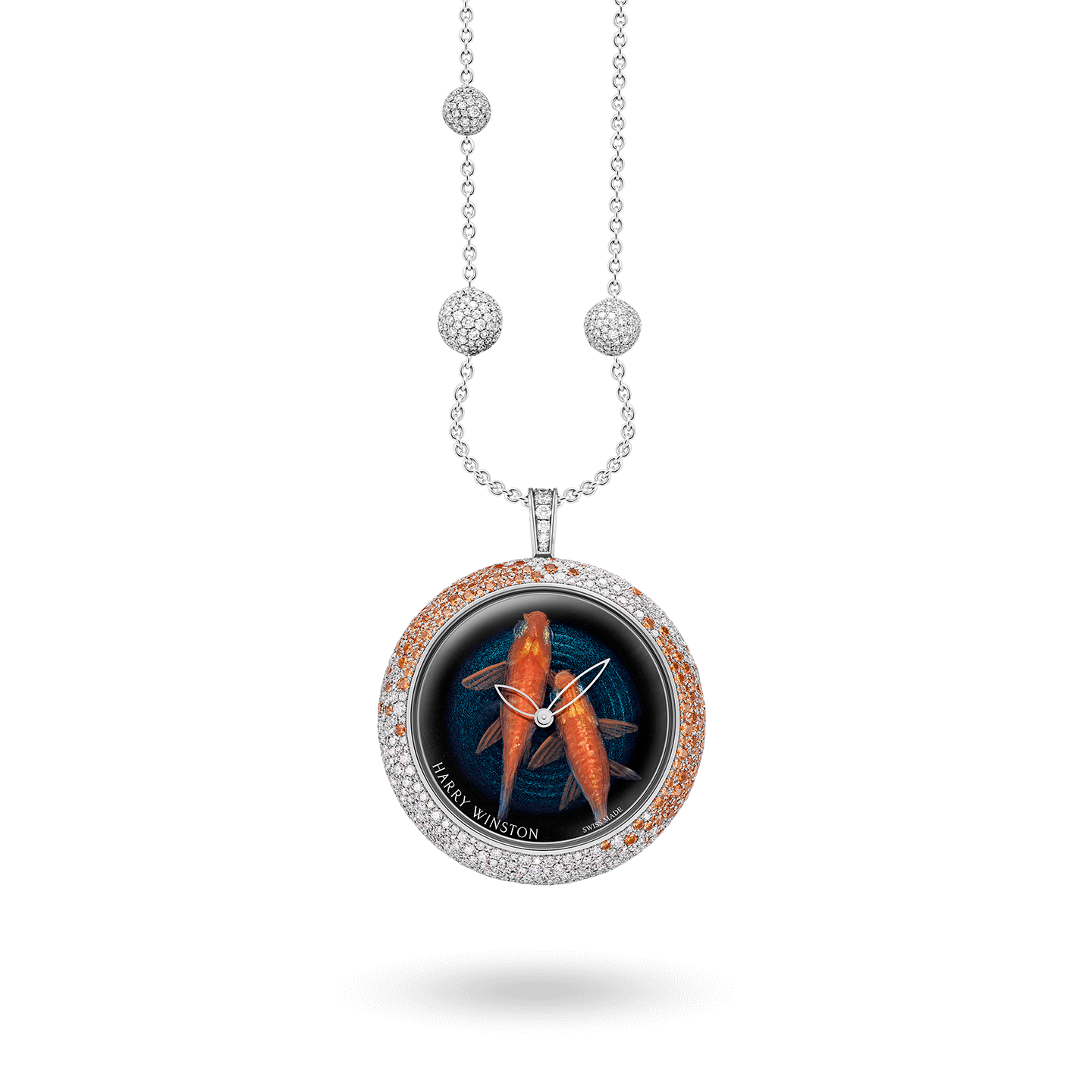 A collection of ten unique timepieces with dials made by internationally acclaimed Japanese artist Riusuke Fukahori. Renowned for his "2.5 Dimensional Painting" technique for goldfish, Fukahori has succeeded in miniaturizing his artwork to fit the confines of a timepiece. This incredible piece of art called "Eternal love" is an 18K white gold timepiece case set with 1482 brilliant-cut diamonds and 279 brilliant-cut orange spessartites. Each unique model comes with a sleek satin strap matching the color of the artwork and a fabulous snow-set diamond necklace chain.