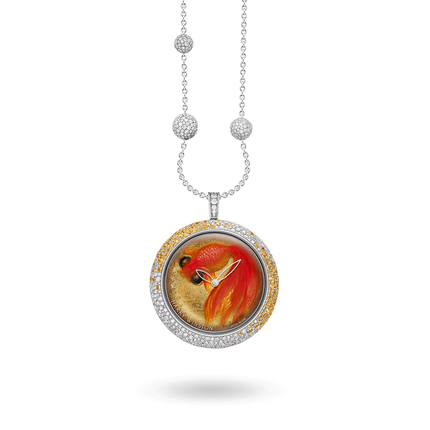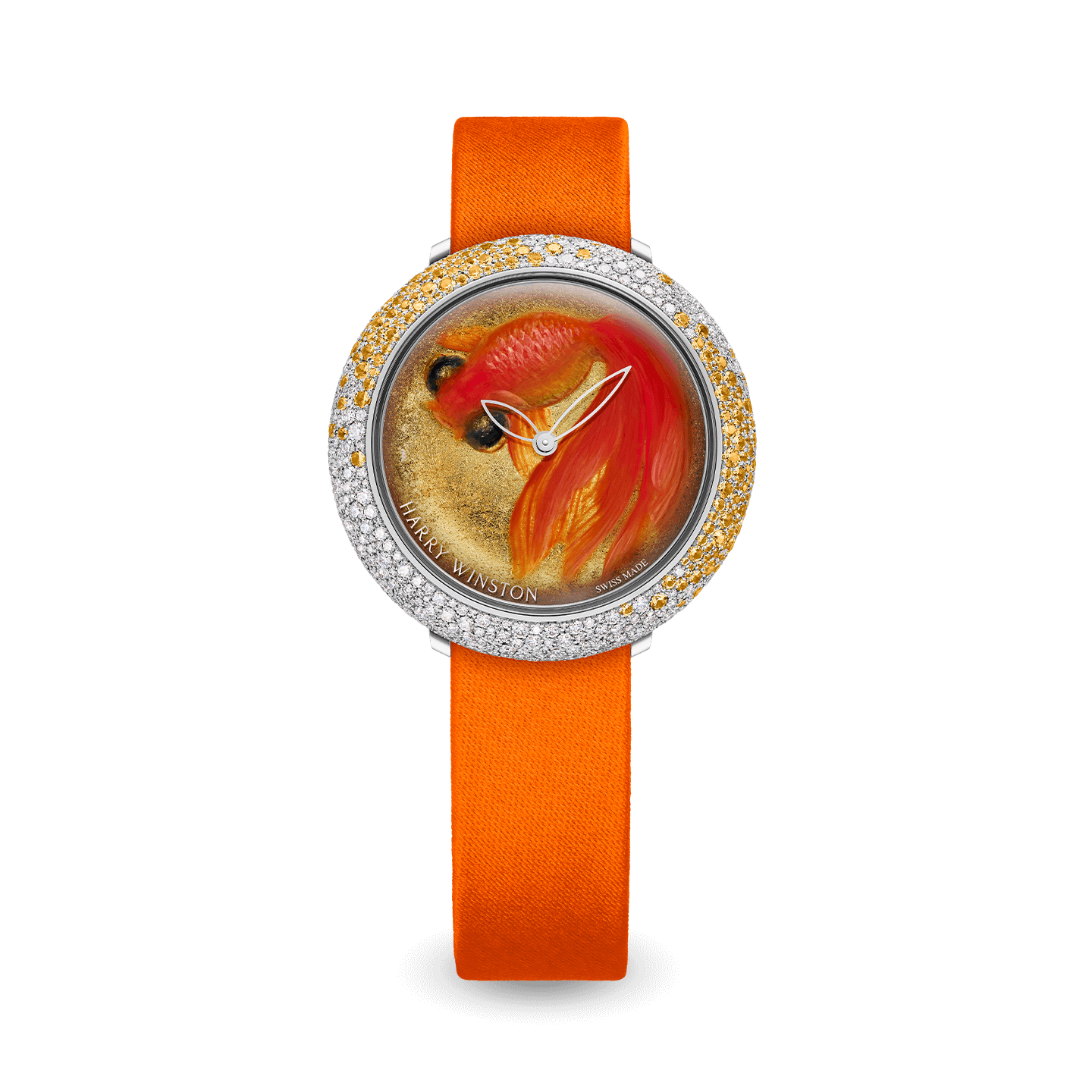 A collection of ten unique timepieces with dials made by internationally acclaimed Japanese artist Riusuke Fukahori. Renowned for his "2.5 Dimensional Painting" technique for goldfish, Fukahori has succeeded in miniaturizing his artwork to fit the confines of a timepiece. This incredible piece of art called "Passionate" is an 18K white gold timepiece case set with 1482 brilliant-cut diamonds and 279 brilliant-cut orange spessartites. Each unique model comes with a sleek satin strap matching the color of the artwork and a fabulous snow-set diamond necklace chain.