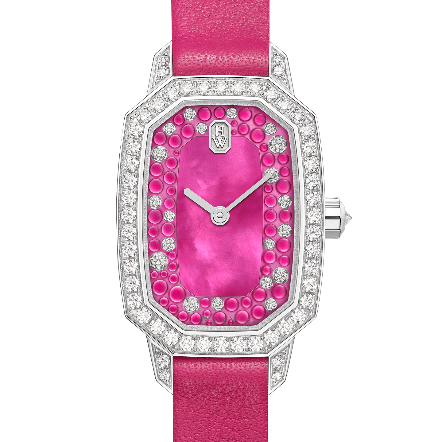 A new palette of captivating colors enriches Harry Winston’s sophisticated Emerald collection. With a winning combination of iridescent mother-of-pearl and icy diamonds, the dial of this Emerald timepiece delights with colorful cabochon adornments.