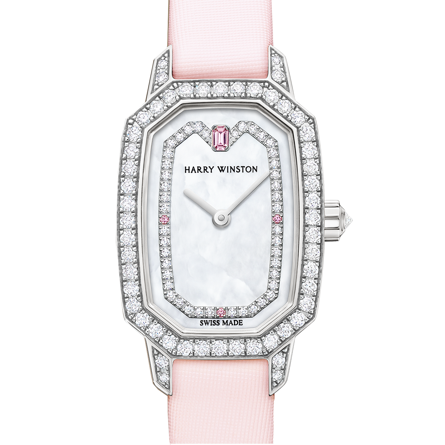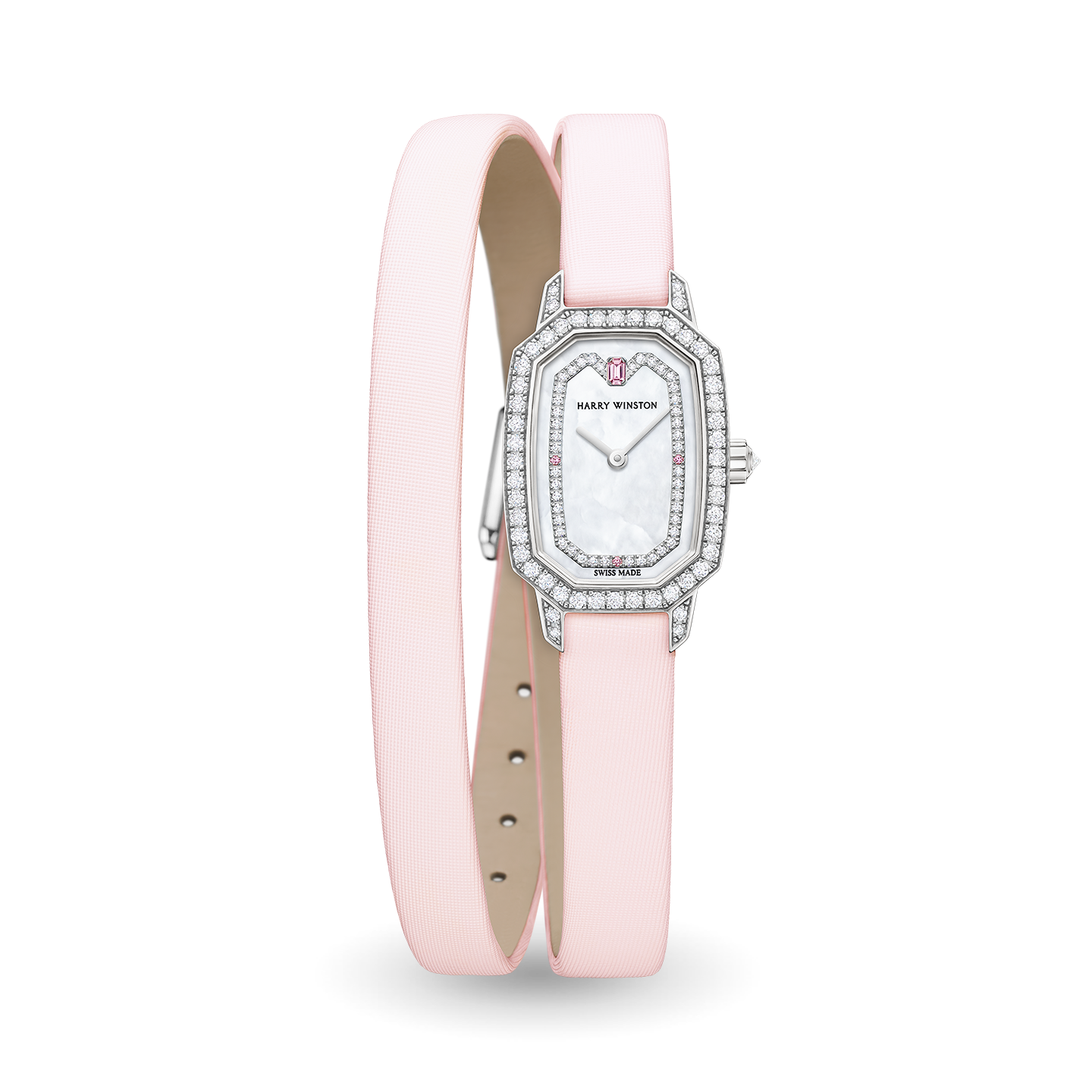 Adorned with soft pink tones, diamonds and mother-of-pearl, the Harry Winston Emerald is the perfect luxury accessory for women who want both the practicality of a timepiece and the hallmark glamour of Harry Winston jewels.