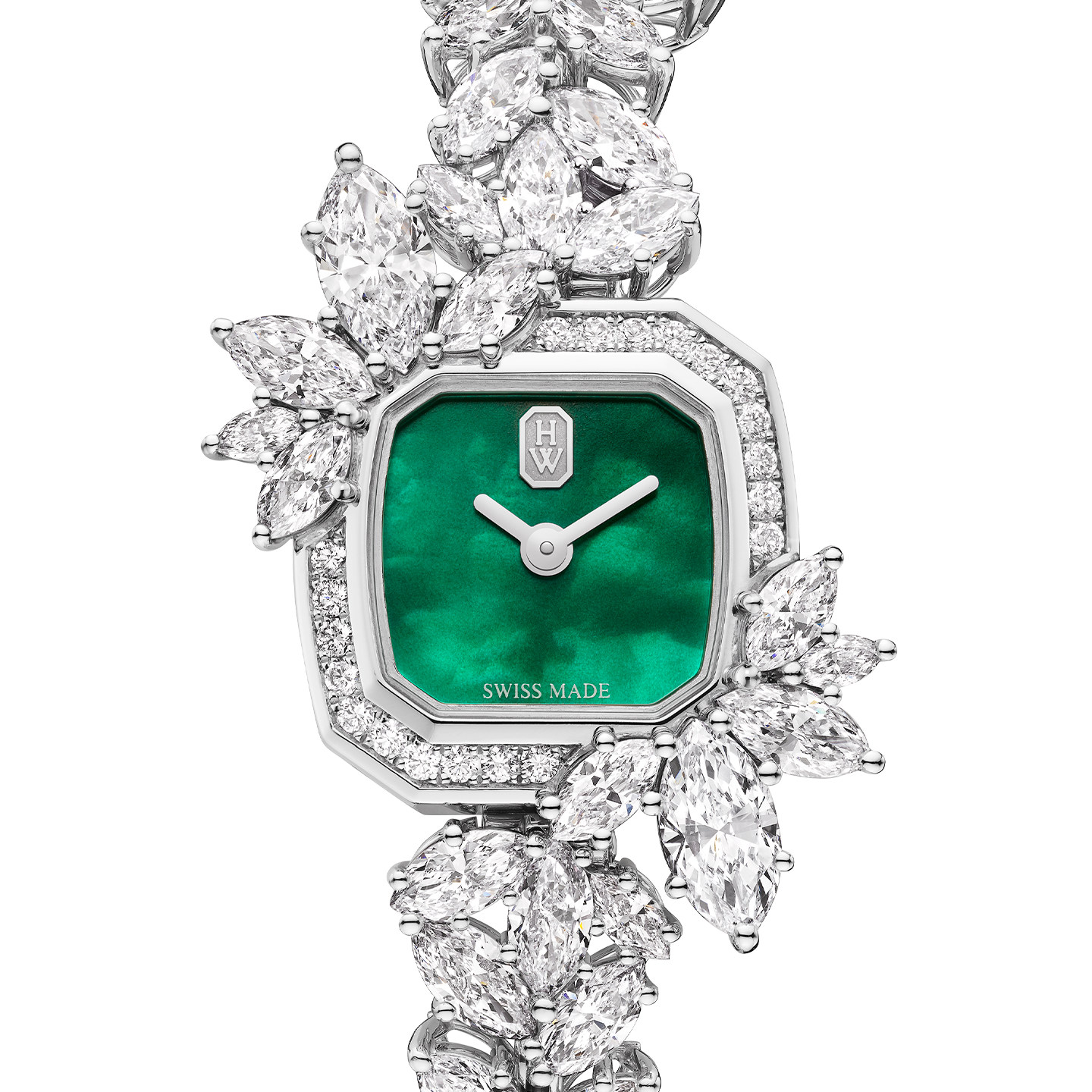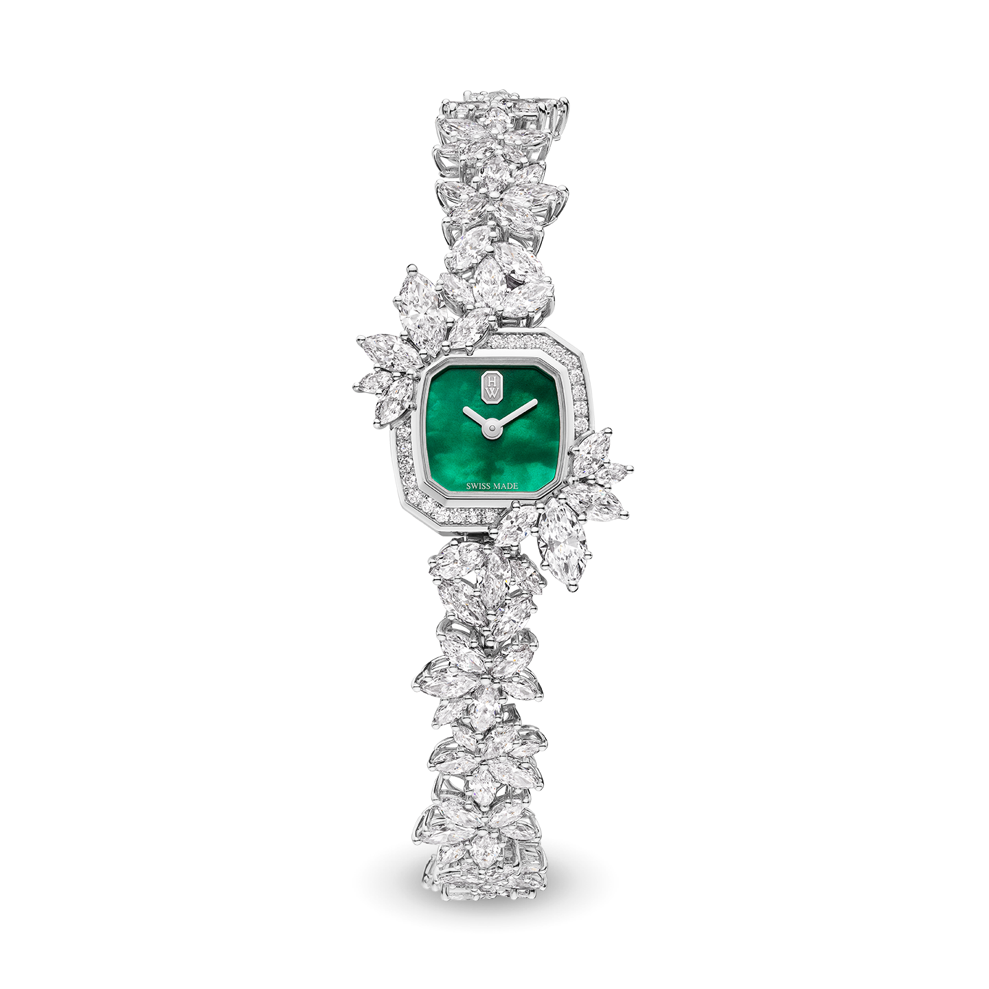 Inspired by the natural world and adorned with Mother Nature’s most precious diamonds, Precious Emerald joins Harry Winston’s High Jewelry Timepiece collection. Recreating motifs that are dear to the House, the timepiece flaunts a stunning platinum bracelet mainly set with marquise-cut diamonds for a dazzling touch of red-carpet glamour.