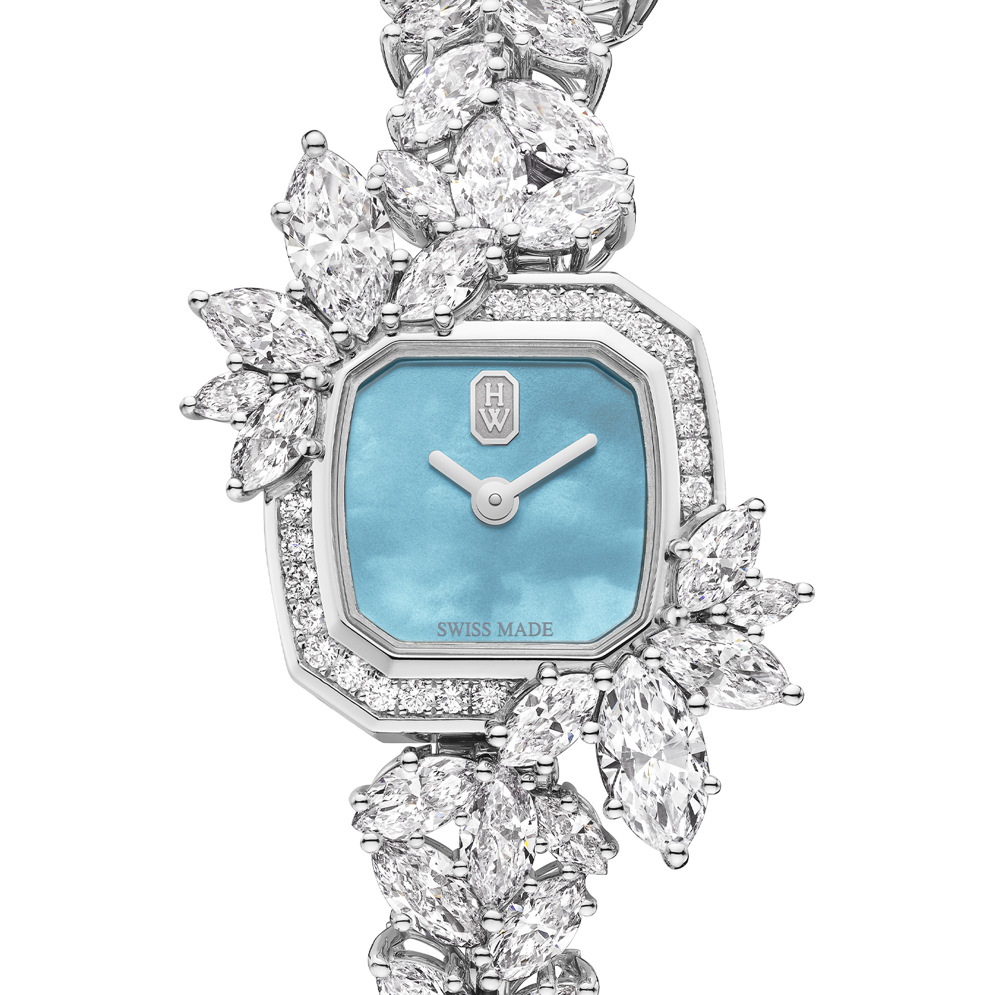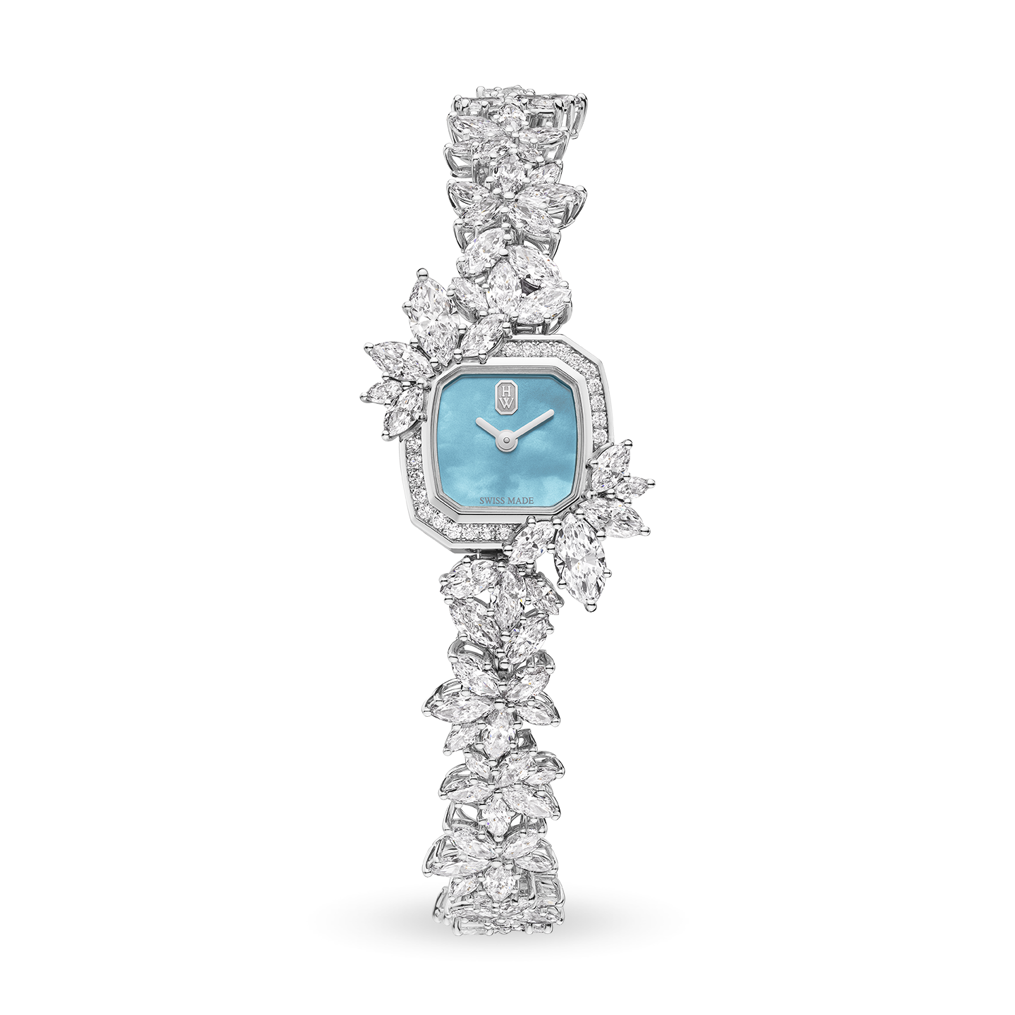 Inspired by the natural world and adorned with Mother Nature’s most precious diamonds, Precious Emerald joins Harry Winston’s High Jewelry Timepiece collection. Recreating motifs that are dear to the House, the timepiece flaunts a stunning platinum bracelet mainly set with marquise-cut diamonds for a dazzling touch of red-carpet glamour.