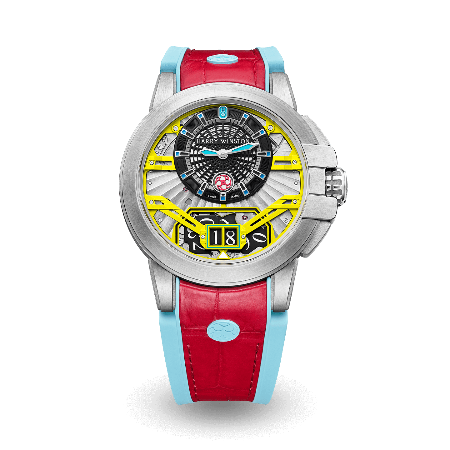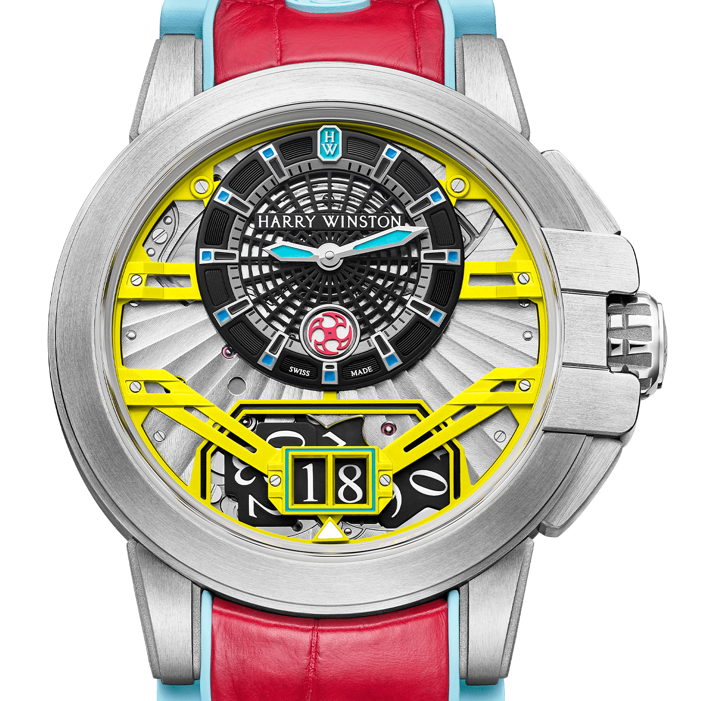 Housed in high-tech Zalium cases, the openworked dials expose their bold, technical architecture, enlivened with tri-colored combinations and splashes of luminescence. The excentered disc for the time and the aperture for the big date complication are anchored to the dial with a series of bridges, evoking the superstructure of New York City’s famous Manhattan Bridge.