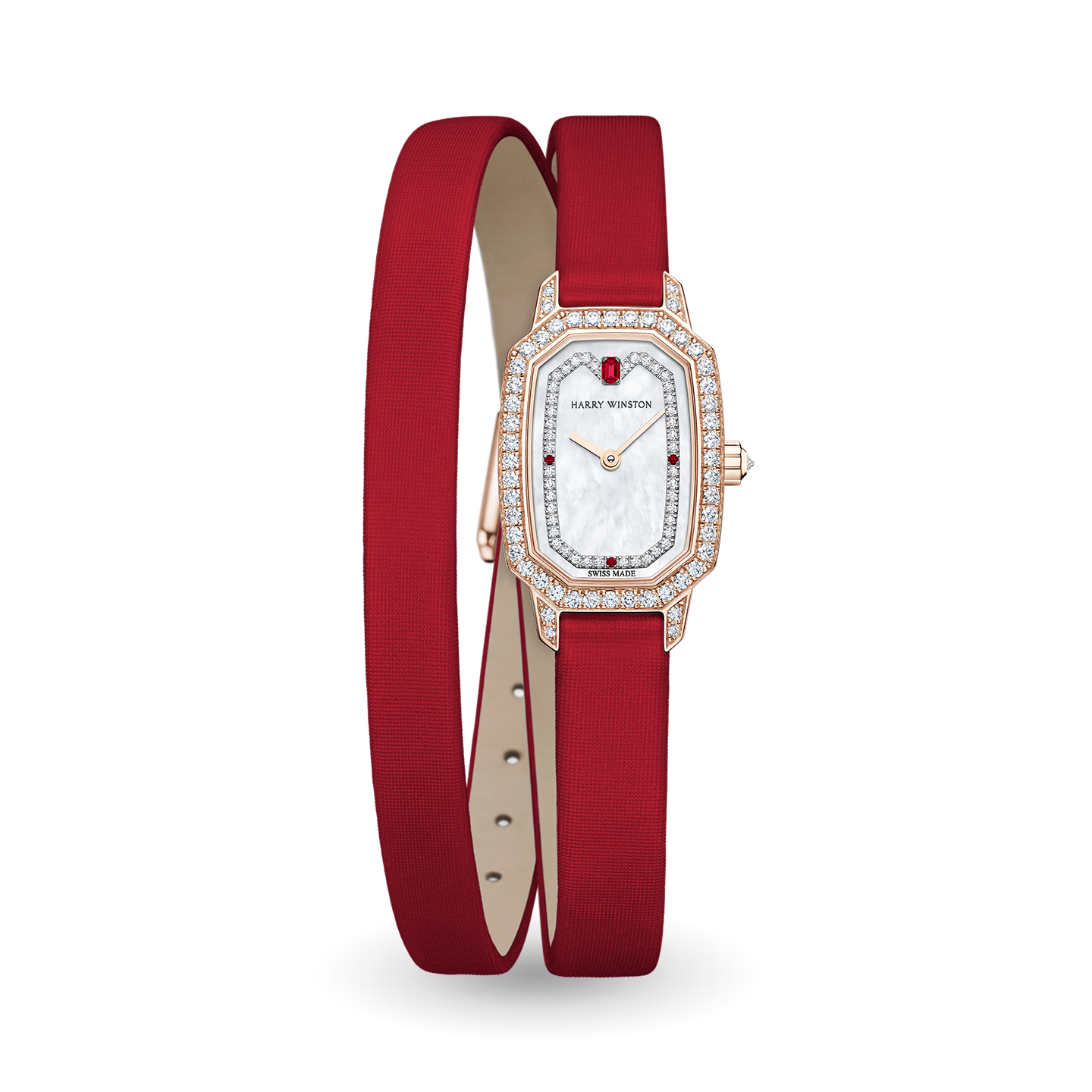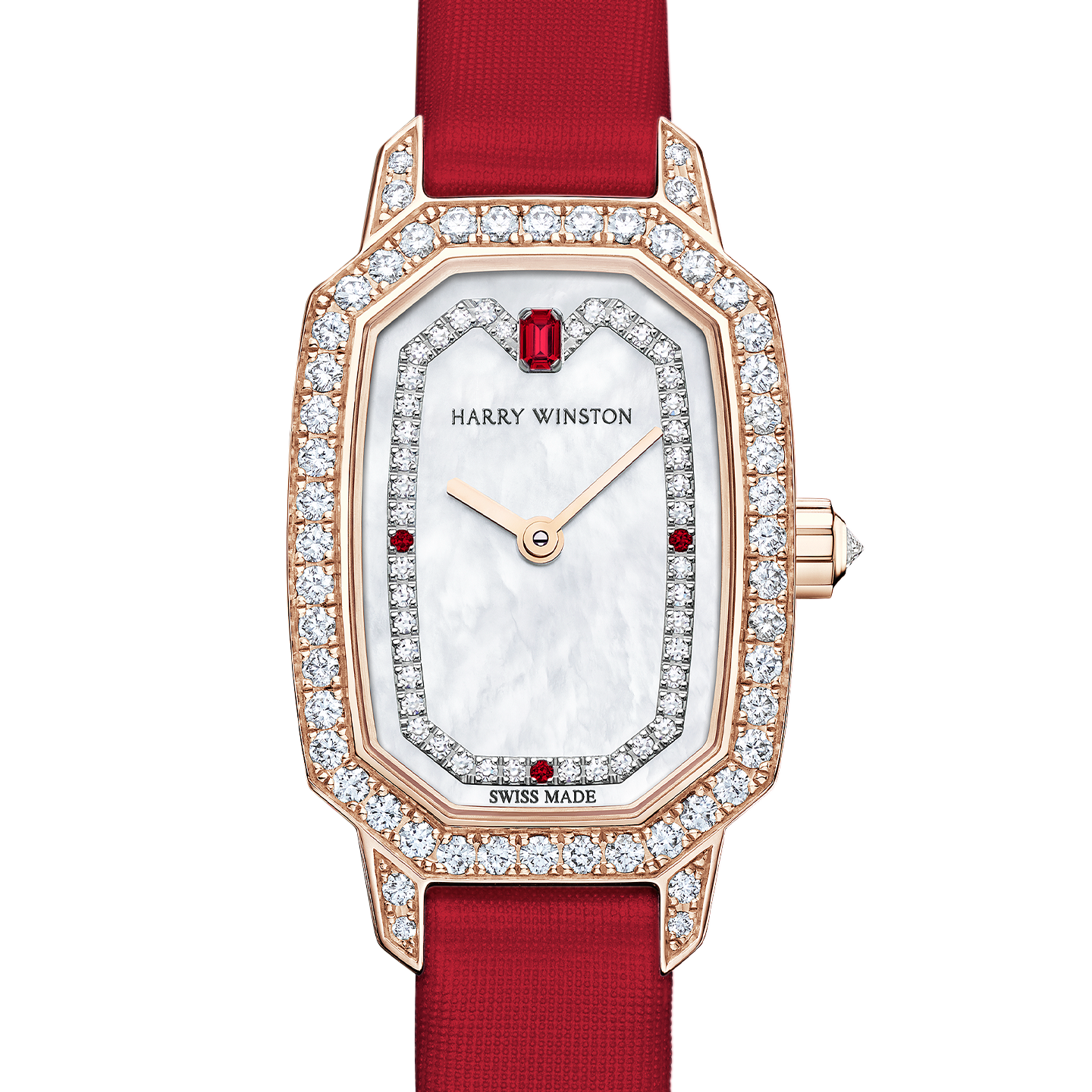Adorned with intense red tones, diamonds and mother-of-pearl, the Harry Winston Emerald is the perfect luxury accessory for women who want both the practicality of a timepiece and the hallmark glamour of Harry Winston jewels.
