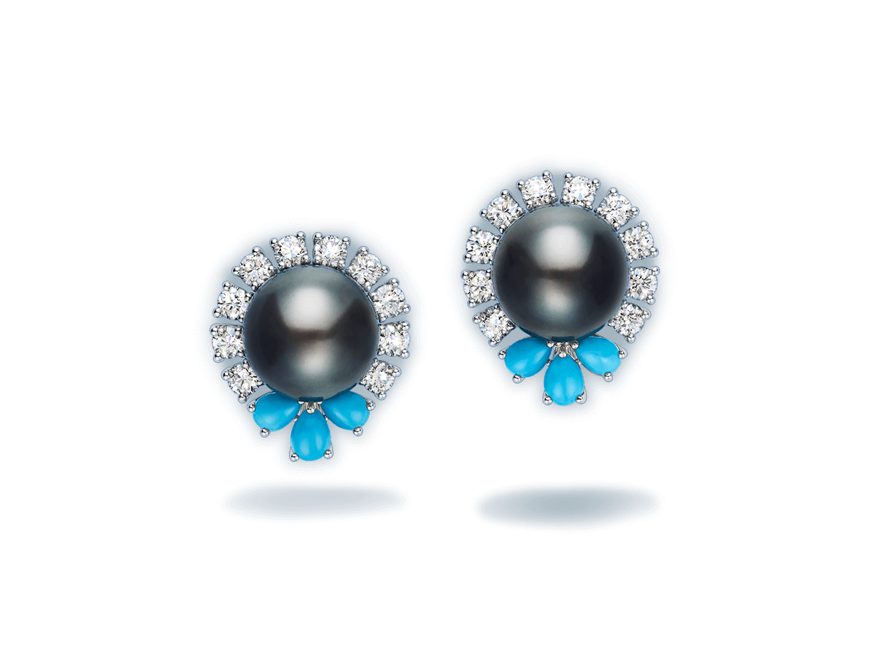 Weighing 10.54 carats each, lustrous black Tahitian pearl center stones come together with cabochon turquoise and diamonds in a bejeweled homage to breathtaking island landscapes.