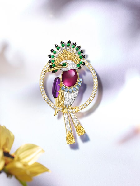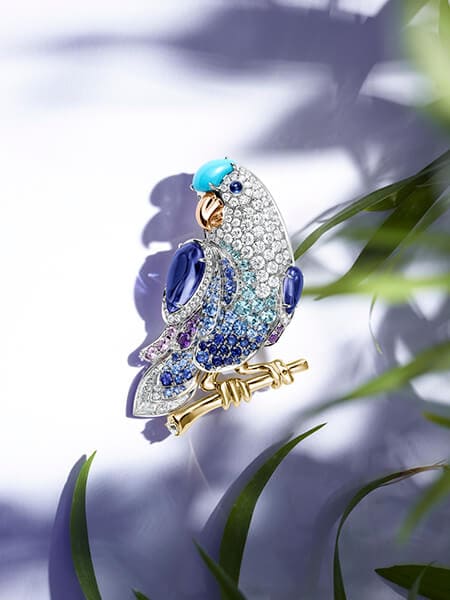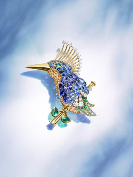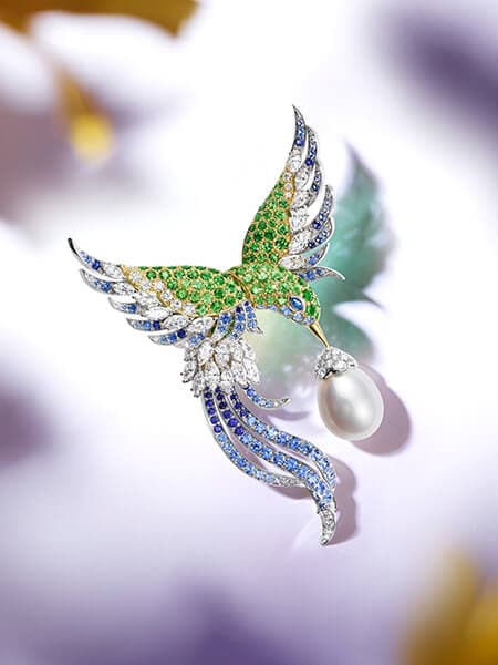 The Hummingbird Brooch evokes the fleeting beauty of its namesake mid-flight. Set with sapphires, tsavorites, aquamarines, and diamonds, the jewel radiates shades of green and blue, echoing the bird’s natural iridescence. A pear-shaped South Sea pearl delicately suspended from its beak evokes the image of the bird sipping nectar, bringing motion and life to this exquisite design.