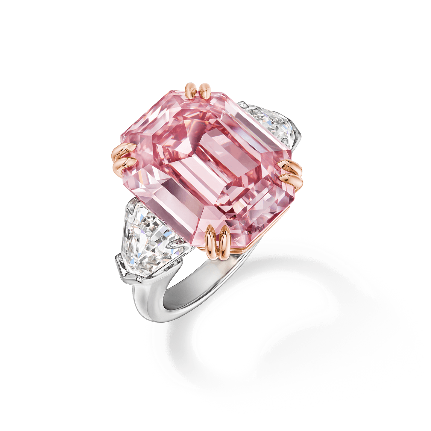 A remarkable 18.96 carat fancy vivid pink diamond, accented with delicate shield-cut colorless diamond side stones, was masterfully set as an extraordinary ring in rose gold and platinum. The Winston Pink Legacy Ring perfectly represents Mr. Winston’s legacy as the King of Diamonds.