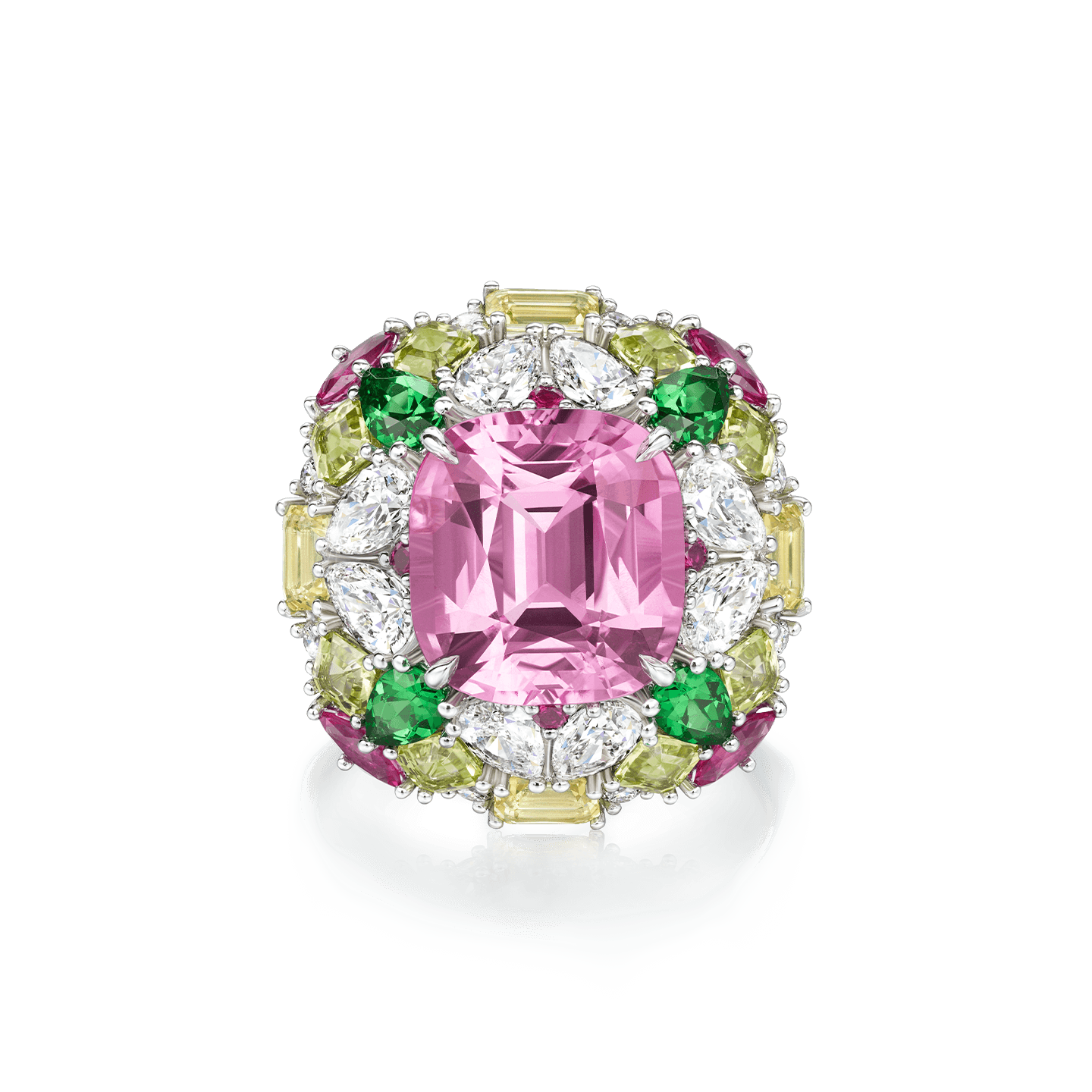 Winston Candy Pink Spinel Ring with Rubies, Yellow Sapphires, Tsavorite Garnets, and Diamonds
