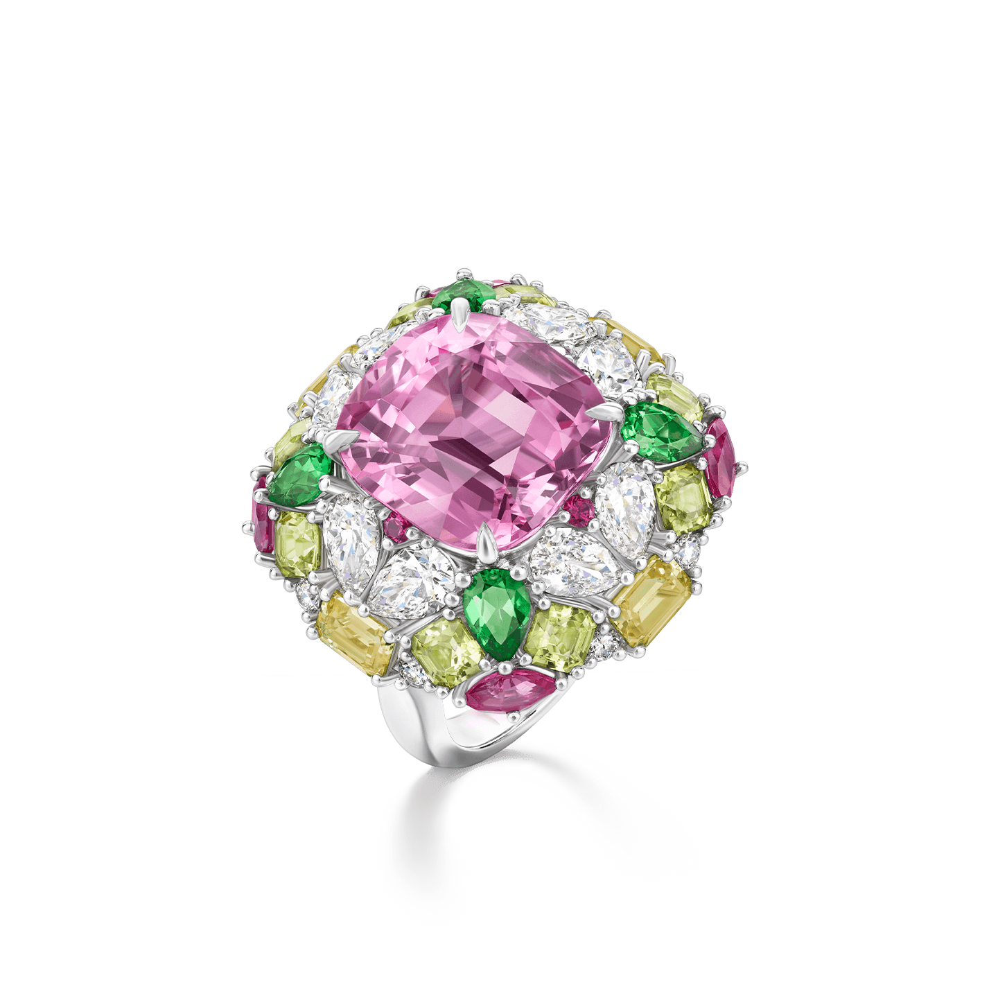 Add a splash of sugary sophistication with this Winston Candy Pink Spinel Ring, starring an 8.09 carat cushion-cut pink spinel. Accented by radiant rubies, yellow sapphires, tsavorite garnets, and sparkling diamonds, this ring is a decadent medley of color and light. Perfect for those ready to sweeten their look with a jewel as vibrant as it is rare.